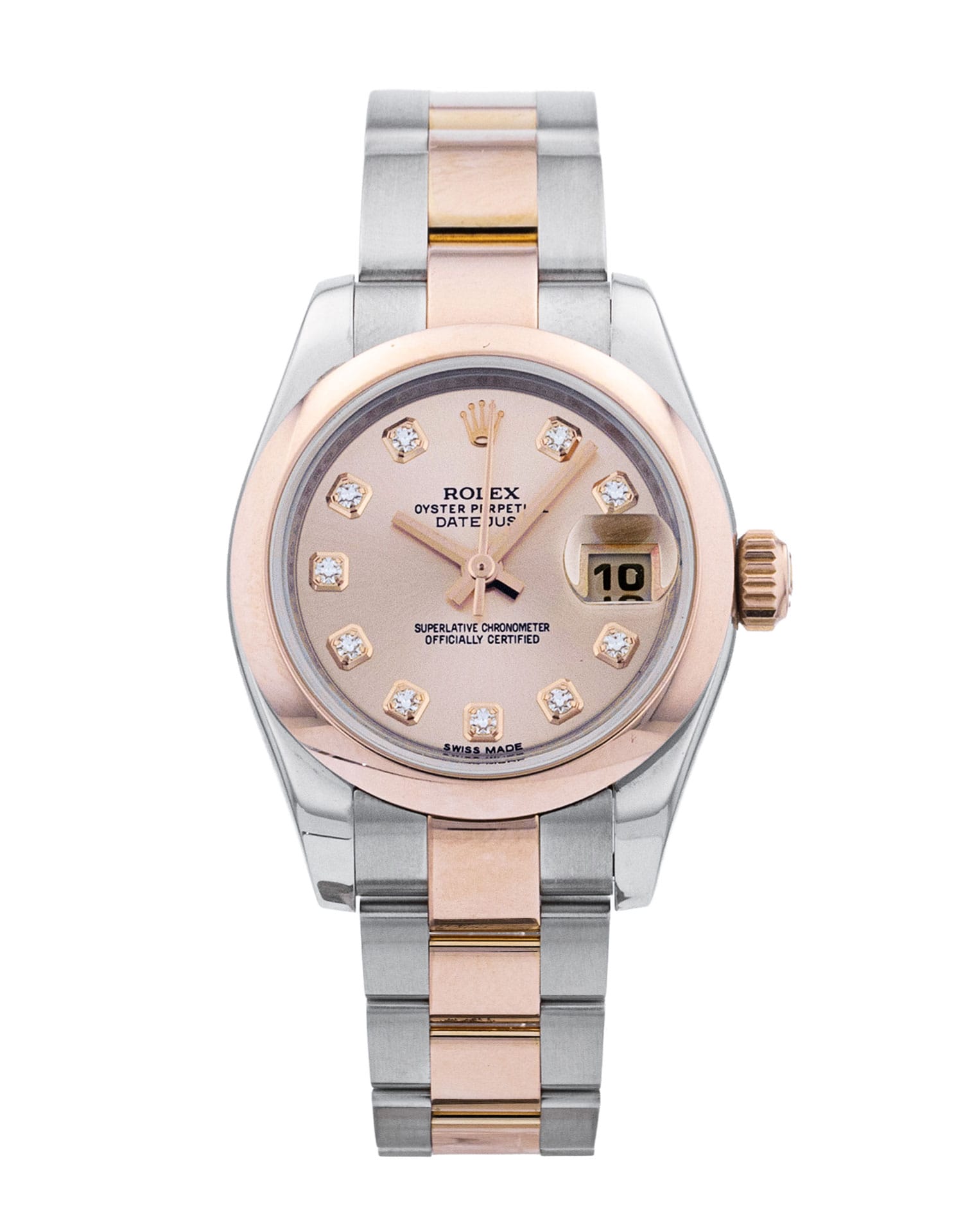 This Rolex Datejust Lady 179161 has a rose diamond dial and a bracelet strap. This Rolex has undergone a thorough inspection of water resistance, accuracy, functionality and condition to determine the level of reconditioning required to meet our strict standards. It has also been referenced against technical documents and manufacturer records where available to ensure authenticity and a clean history. All our watches have a 24-month warranty for your peace of mind. One of our skilled polishing technicians has removed marks on the case and bracelet of this watch, brought about by daily wear and tear, which is why this watch does not come with the remaining manufacturer’s warranty.