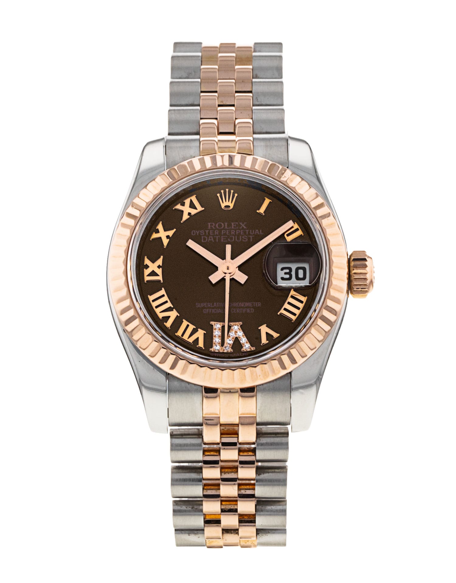 This Rolex Datejust Lady 179171 has a chocolate roman numeral diamond dial and a bracelet strap. This Rolex has undergone a thorough inspection of water resistance, accuracy, functionality and condition to determine the level of reconditioning required to meet our strict standards. It has also been referenced against technical documents and manufacturer records where available to ensure authenticity and a clean history. All our watches have a 24-month warranty for your peace of mind. One of our skilled polishing technicians has removed marks on the case and bracelet of this watch, brought about by daily wear and tear, which is why this watch does not come with the remaining manufacturer’s warranty.