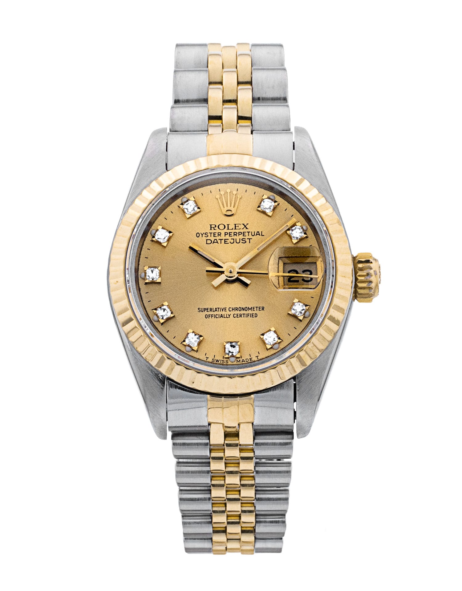 This Rolex Datejust Lady 69173 has a champagne diamond dial and a bracelet strap. This Rolex has undergone a thorough inspection of water resistance, accuracy, functionality and condition to determine the level of reconditioning required to meet our strict standards. It has also been referenced against technical documents and manufacturer records where available to ensure authenticity and a clean history. All our watches have a 24-month warranty for your peace of mind. One of our skilled polishing technicians has removed marks on the case and bracelet of this watch, brought about by daily wear and tear, which is why this watch does not come with the remaining manufacturer’s warranty.