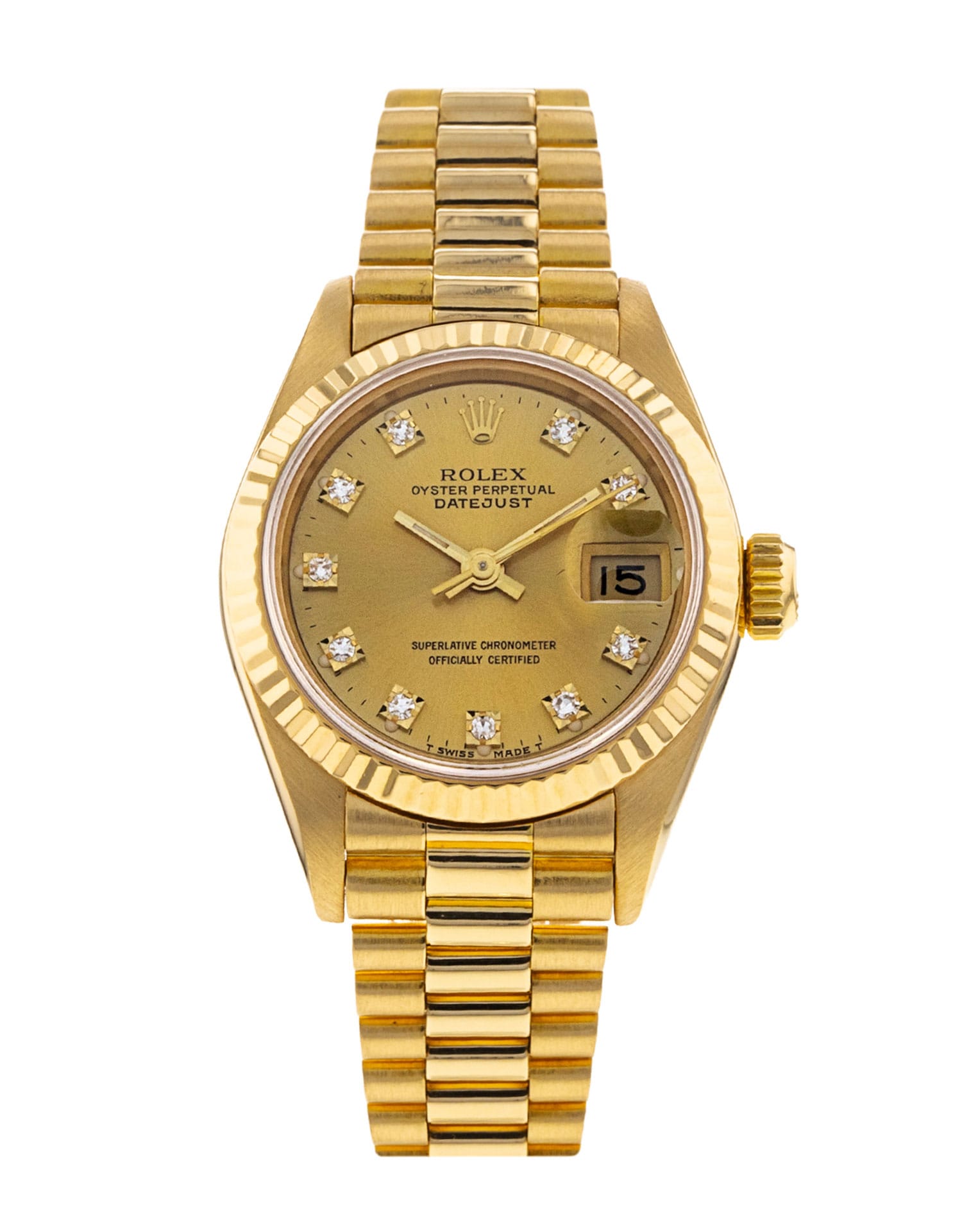 This Rolex Datejust Lady 69178 has a champagne diamond dial and a bracelet strap. This Rolex has undergone a thorough inspection of water resistance, accuracy, functionality and condition to determine the level of reconditioning required to meet our strict standards. It has also been referenced against technical documents and manufacturer records where available to ensure authenticity and a clean history. All our watches have a 24-month warranty for your peace of mind. One of our skilled polishing technicians has removed marks on the case and bracelet of this watch, brought about by daily wear and tear, which is why this watch does not come with the remaining manufacturer’s warranty.