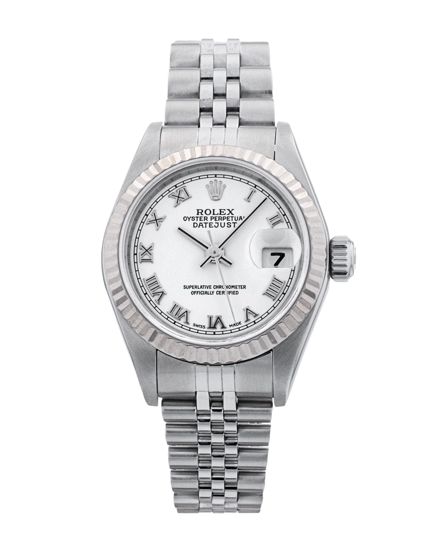 This Rolex Datejust Lady 79174 has a white roman numeral dial and a bracelet strap. This Rolex has undergone a thorough inspection of water resistance, accuracy, functionality and condition to determine the level of reconditioning required to meet our strict standards. It has also been referenced against technical documents and manufacturer records where available to ensure authenticity and a clean history. All our watches have a 24-month warranty for your peace of mind. One of our skilled polishing technicians has removed marks on the case and bracelet of this watch, brought about by daily wear and tear, which is why this watch does not come with the remaining manufacturer’s warranty.