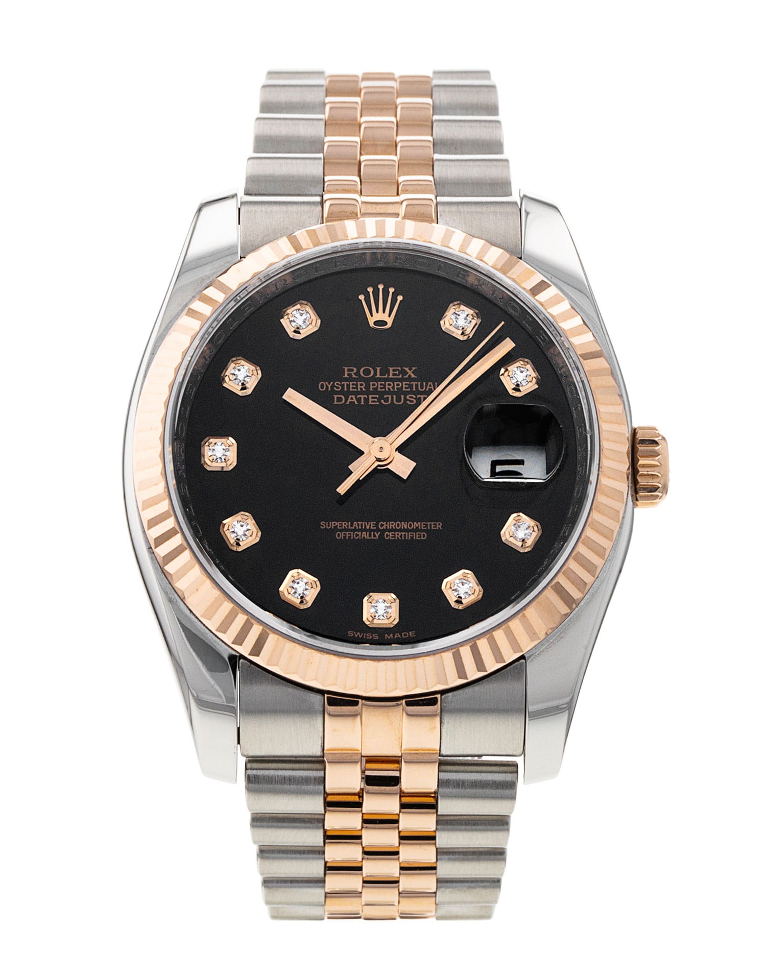 This Rolex Datejust 116231 has a black diamond dial and a bracelet strap. This Rolex has undergone a thorough inspection of water resistance, accuracy, functionality and condition to determine the level of reconditioning required to meet our strict standards. It has also been referenced against technical documents and manufacturer records where available to ensure authenticity and a clean history. All our watches have a 24-month warranty for your peace of mind. One of our skilled polishing technicians has removed marks on the case and bracelet of this watch, brought about by daily wear and tear, which is why this watch does not come with the remaining manufacturer’s warranty.