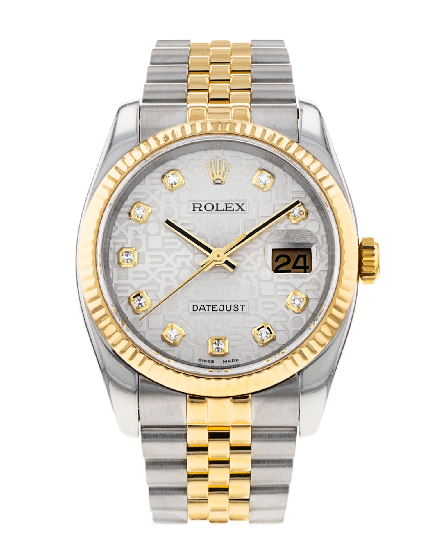 This Rolex Datejust 116233 has a silver jubilee diamond dial and a bracelet strap. This Rolex has undergone a thorough inspection of water resistance, accuracy, functionality and condition to determine the level of reconditioning required to meet our strict standards. It has also been referenced against technical documents and manufacturer records where available to ensure authenticity and a clean history. All our watches have a 24-month warranty for your peace of mind. One of our skilled polishing technicians has removed marks on the case and bracelet of this watch, brought about by daily wear and tear, which is why this watch does not come with the remaining manufacturer’s warranty.