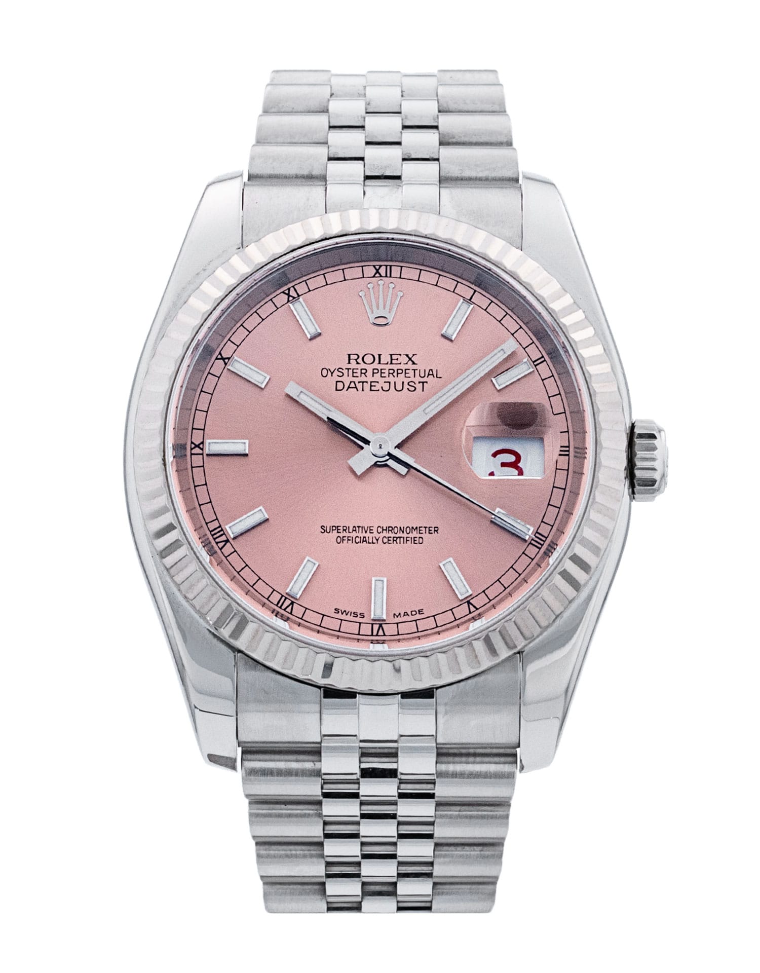This Rolex Datejust 116234 has a pink baton dial and a bracelet strap. This Rolex has undergone a thorough inspection of water resistance, accuracy, functionality and condition to determine the level of reconditioning required to meet our strict standards. It has also been referenced against technical documents and manufacturer records where available to ensure authenticity and a clean history. All our watches have a 24-month warranty for your peace of mind. One of our skilled polishing technicians has removed marks on the case and bracelet of this watch, brought about by daily wear and tear, which is why this watch does not come with the remaining manufacturer’s warranty.