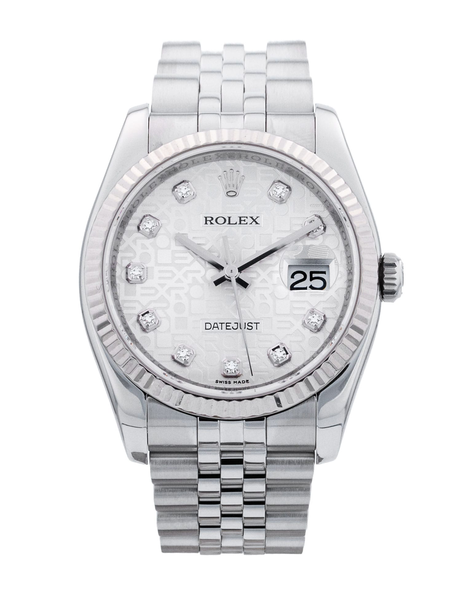 This Rolex Datejust 116234 has a silver jubilee diamond dial and a bracelet strap. This Rolex has undergone a thorough inspection of water resistance, accuracy, functionality and condition to determine the level of reconditioning required to meet our strict standards. It has also been referenced against technical documents and manufacturer records where available to ensure authenticity and a clean history. Our watches have a 24-month warranty for your peace of mind, in conjunction with any remaining manufacturer’s warranty from new or from service. To maintain the manufacturer’s warranty on this watch, it has not been polished in our service centre.