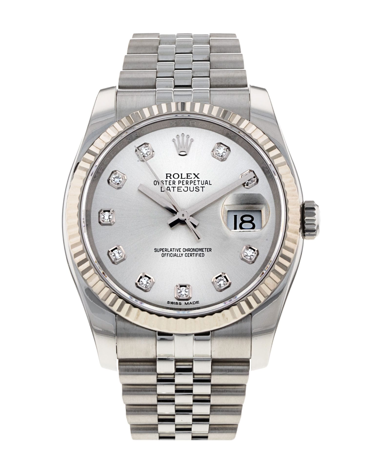 This Rolex Datejust 116234 has a silver diamond dial and a bracelet strap. This Rolex has undergone a thorough inspection of water resistance, accuracy, functionality and condition to determine the level of reconditioning required to meet our strict standards. It has also been referenced against technical documents and manufacturer records where available to ensure authenticity and a clean history. All our watches have a 24-month warranty for your peace of mind. One of our skilled polishing technicians has removed marks on the case and bracelet of this watch, brought about by daily wear and tear, which is why this watch does not come with the remaining manufacturer’s warranty.