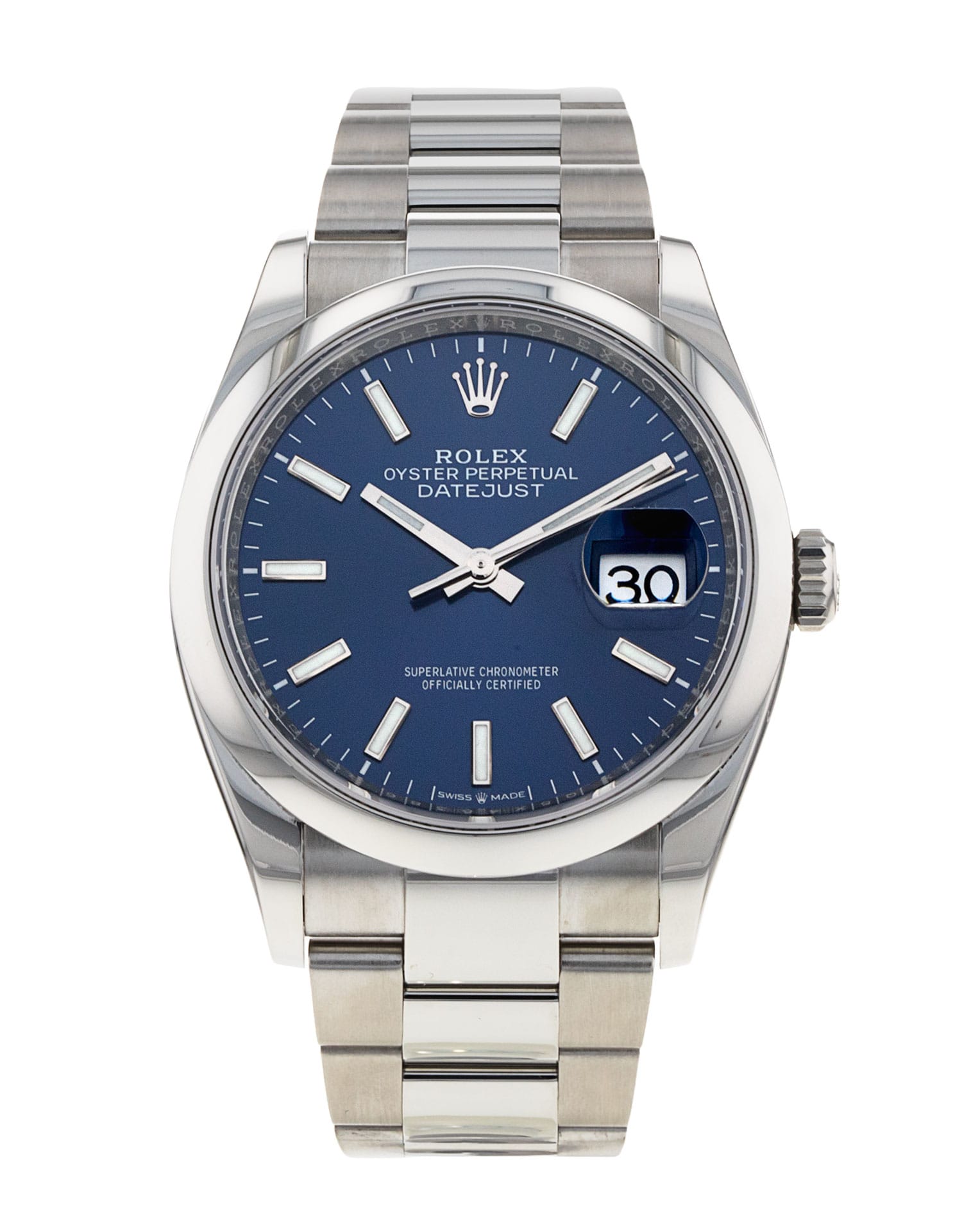 This Rolex Datejust 126200 has a blue baton dial and a bracelet strap. This Rolex has undergone a thorough inspection of water resistance, accuracy, functionality and condition to determine the level of reconditioning required to meet our strict standards. It has also been referenced against technical documents and manufacturer records where available to ensure authenticity and a clean history. All our watches have a 24-month warranty for your peace of mind. One of our skilled polishing technicians has removed marks on the case and bracelet of this watch, brought about by daily wear and tear, which is why this watch does not come with the remaining manufacturer’s warranty.