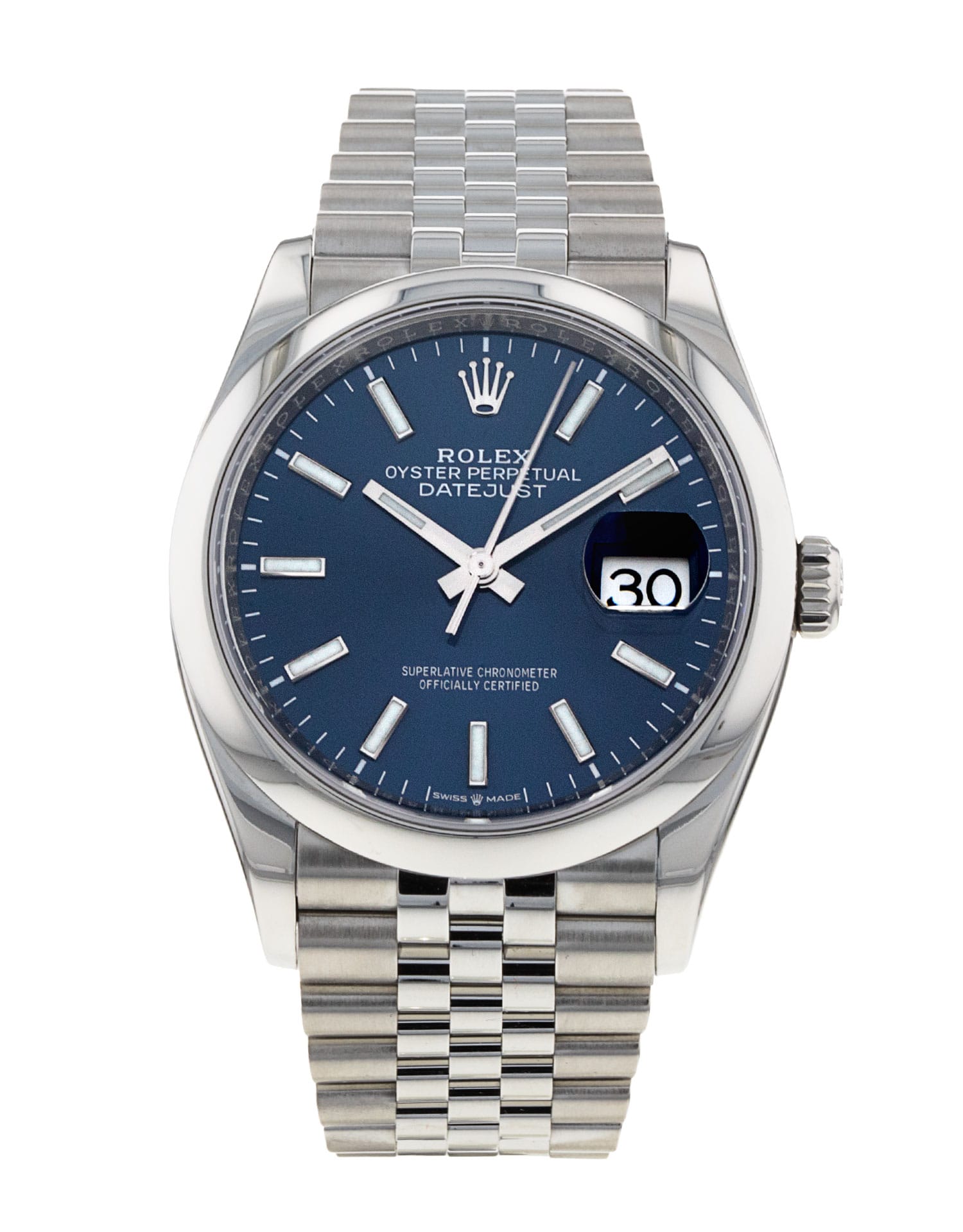This Rolex Datejust 126200 has a blue baton dial and a bracelet strap. This Rolex has undergone a thorough inspection of water resistance, accuracy, functionality and condition to determine the level of reconditioning required to meet our strict standards. It has also been referenced against technical documents and manufacturer records where available to ensure authenticity and a clean history. All our watches have a 24-month warranty for your peace of mind. One of our skilled polishing technicians has removed marks on the case and bracelet of this watch, brought about by daily wear and tear, which is why this watch does not come with the remaining manufacturer’s warranty.