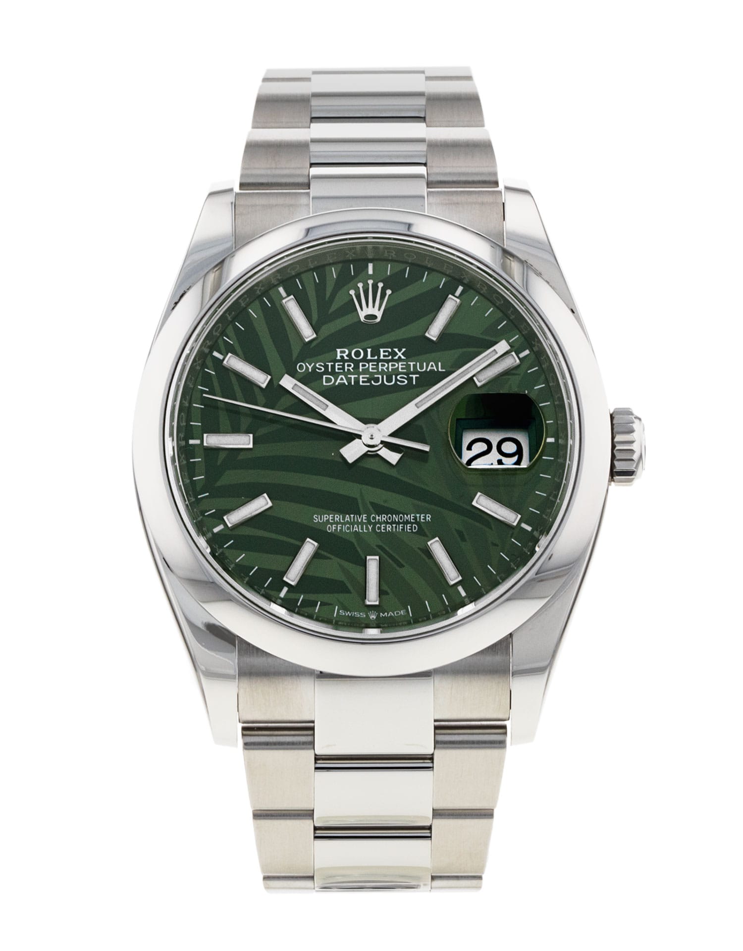 This Rolex Datejust 126200 has a olive green palm motif dial and a bracelet strap. This Rolex has undergone a thorough inspection of water resistance, accuracy, functionality and condition to determine the level of reconditioning required to meet our strict standards. It has also been referenced against technical documents and manufacturer records where available to ensure authenticity and a clean history. Our watches have a 24-month warranty for your peace of mind, in conjunction with any remaining manufacturer’s warranty from new or from service. To maintain the manufacturer’s warranty on this watch, it has not been polished in our service centre.