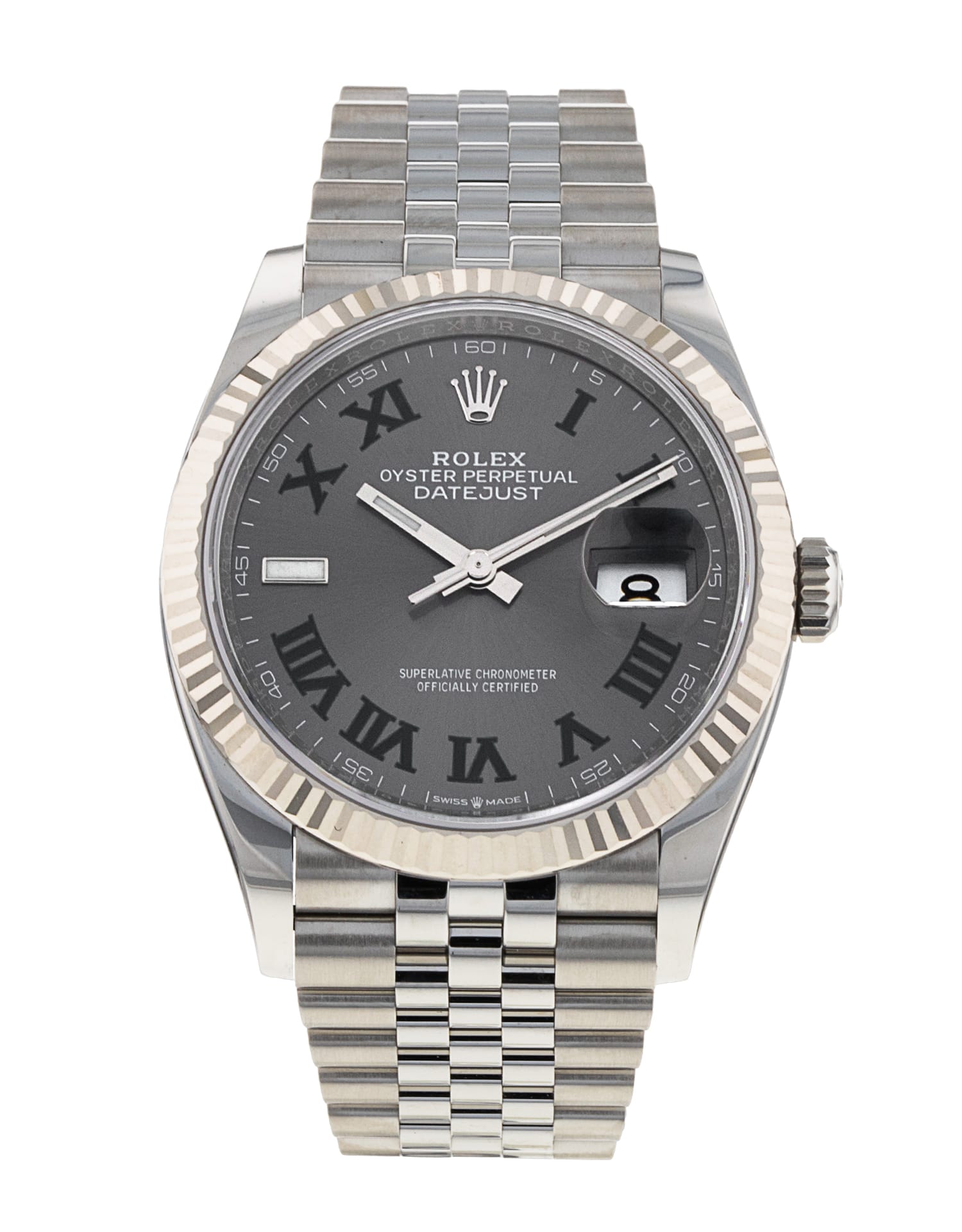 This Rolex Datejust 126234 has a slate roman numeral dial and a bracelet strap. This Rolex has undergone a thorough inspection of water resistance, accuracy, functionality and condition to determine the level of reconditioning required to meet our strict standards. It has also been referenced against technical documents and manufacturer records where available to ensure authenticity and a clean history. Our watches have a 24-month warranty for your peace of mind, in conjunction with any remaining manufacturer’s warranty from new or from service. To maintain the manufacturer’s warranty on this watch, it has not been polished in our service centre.
