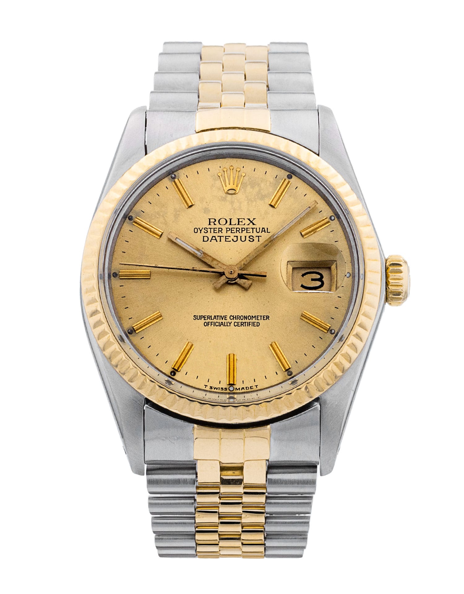 This Rolex Datejust 16013 has a champagne baton dial and a bracelet strap. Due to age, this Rolex may not fall within our typical expected tolerances for timekeeping, and is no longer suitable for use in wet environments or submersion in water. In the interests of preserving original features, utmost care has been taken to sympathetically restore this watch. It has also been referenced against technical documents and manufacturer records where available to ensure authenticity and a clean history. One of our skilled polishing technicians has removed marks on the case and bracelet of this watch, brought about by daily wear and tear, which is why this watch does not come with the remaining manufacturer’s warranty.