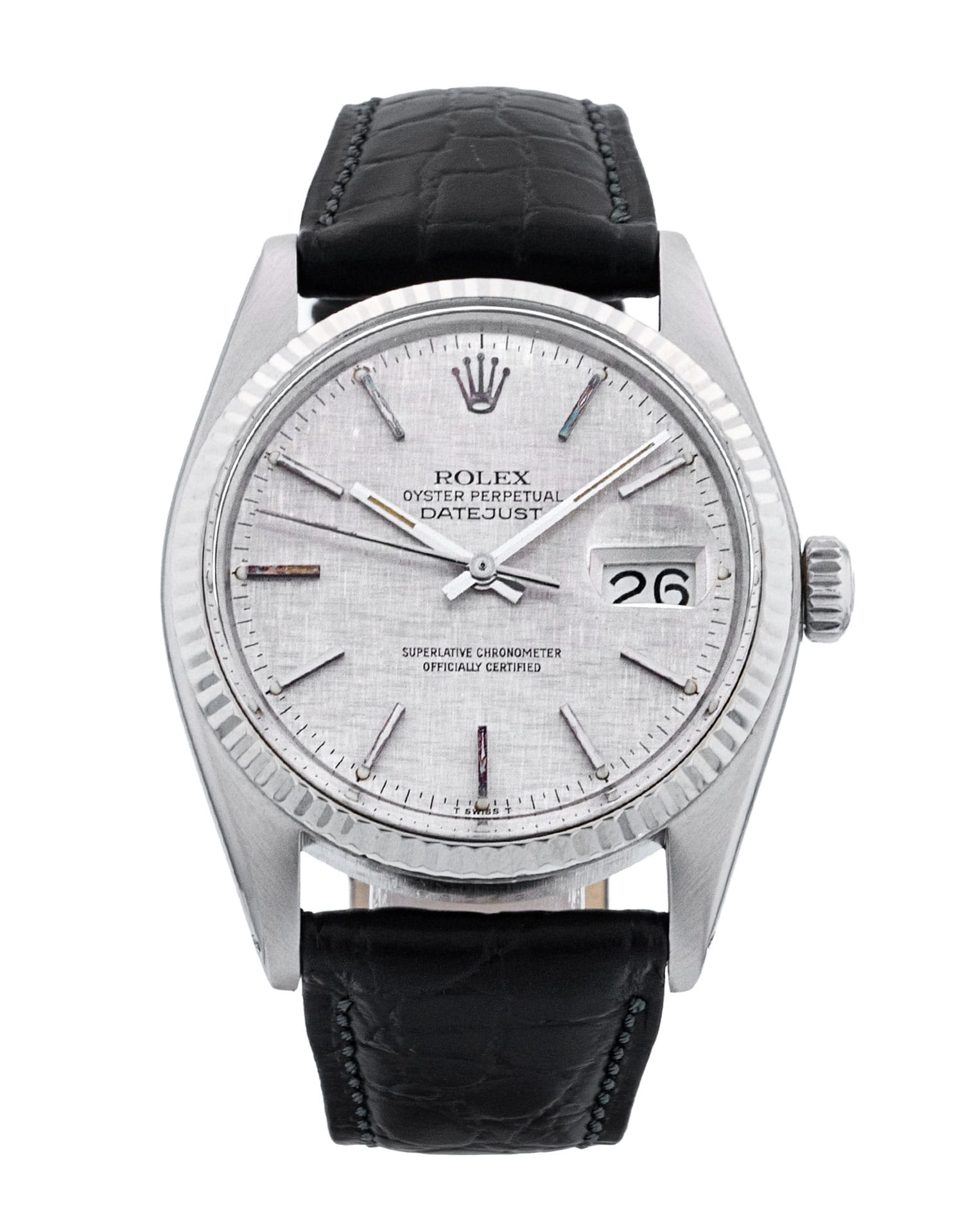 This Rolex Datejust 16014 has a baton argent dial and a leather strap. Due to age, this Rolex may not fall within our typical expected tolerances for timekeeping, and is no longer suitable for use in wet environments or submersion in water. In the interests of preserving original features, utmost care has been taken to sympathetically restore this watch. It has also been referenced against technical documents and manufacturer records where available to ensure authenticity and a clean history. One of our skilled polishing technicians has removed marks on the case and bracelet of this watch, brought about by daily wear and tear, which is why this watch does not come with the remaining manufacturer’s warranty.