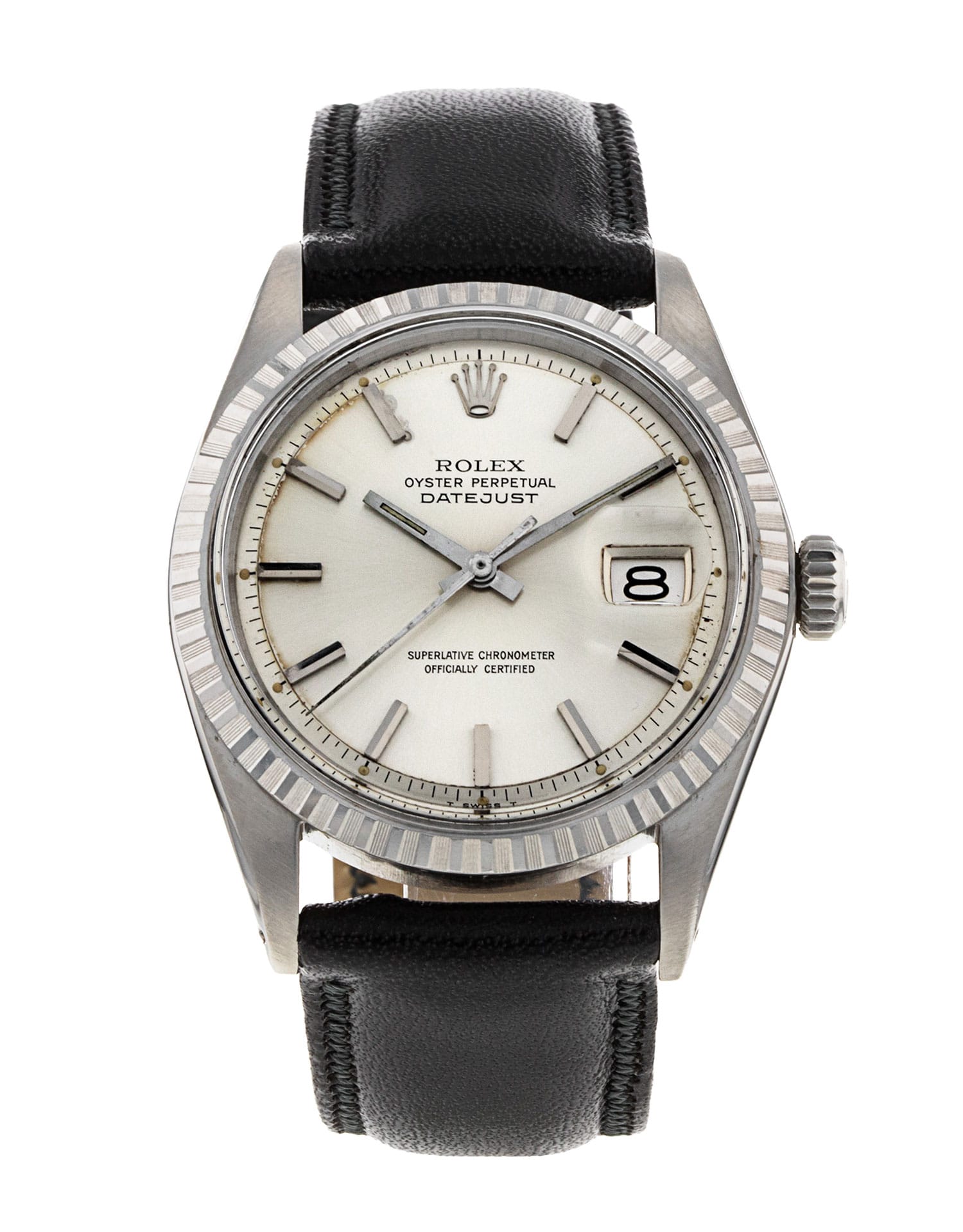 This Rolex Datejust 1603 has a silver baton dial and a leather strap. Due to age, this Rolex may not fall within our typical expected tolerances for timekeeping, and is no longer suitable for use in wet environments or submersion in water. In the interests of preserving original features, utmost care has been taken to sympathetically restore this watch. It has also been referenced against technical documents and manufacturer records where available to ensure authenticity and a clean history. One of our skilled polishing technicians has removed marks on the case and bracelet of this watch, brought about by daily wear and tear, which is why this watch does not come with the remaining manufacturer’s warranty.