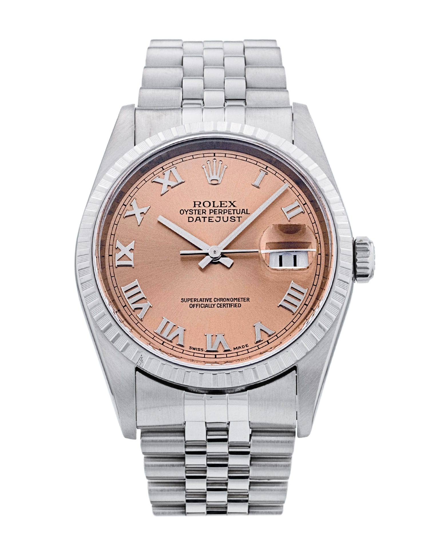 This Rolex Datejust 16220 has a salmon roman numeral dial and a bracelet strap. This Rolex has undergone a thorough inspection of water resistance, accuracy, functionality and condition to determine the level of reconditioning required to meet our strict standards. It has also been referenced against technical documents and manufacturer records where available to ensure authenticity and a clean history. All our watches have a 24-month warranty for your peace of mind. One of our skilled polishing technicians has removed marks on the case and bracelet of this watch, brought about by daily wear and tear, which is why this watch does not come with the remaining manufacturer’s warranty.