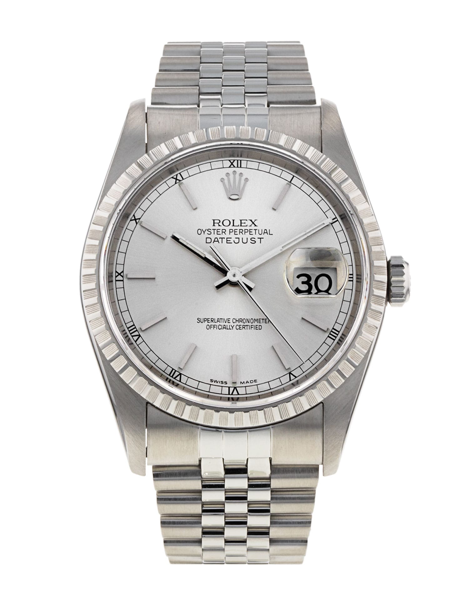This Rolex Datejust 16220 has a silver baton dial and a bracelet strap. This Rolex has undergone a thorough inspection of water resistance, accuracy, functionality and condition to determine the level of reconditioning required to meet our strict standards. It has also been referenced against technical documents and manufacturer records where available to ensure authenticity and a clean history. All our watches have a 24-month warranty for your peace of mind. One of our skilled polishing technicians has removed marks on the case and bracelet of this watch, brought about by daily wear and tear, which is why this watch does not come with the remaining manufacturer’s warranty.