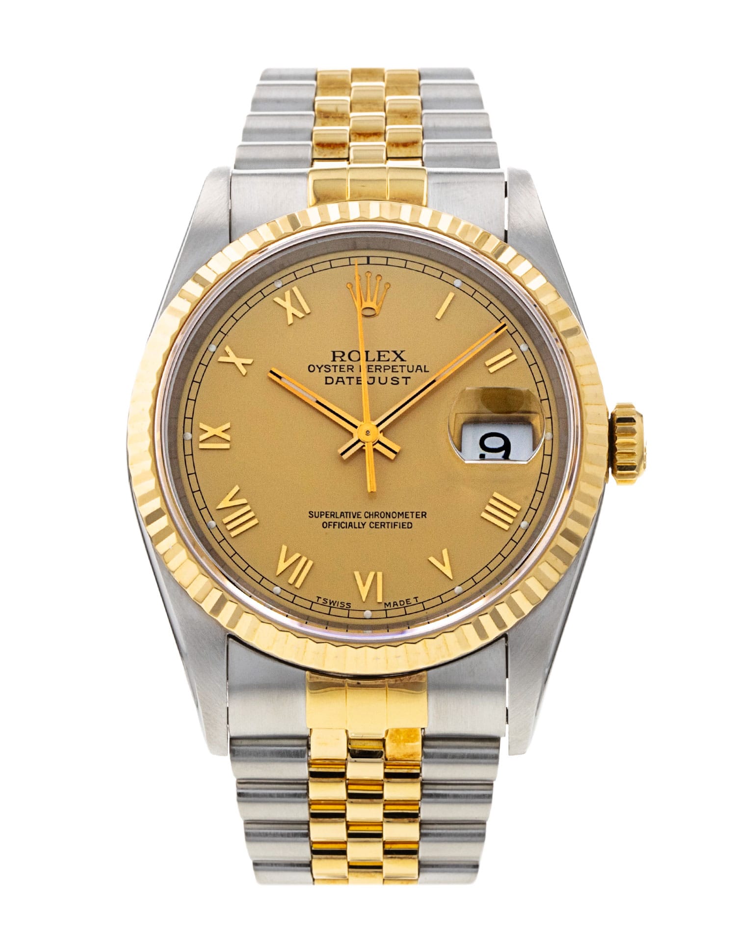 This Rolex Datejust 16233 has a champagne roman numeral dial and a bracelet strap. This Rolex has undergone a thorough inspection of water resistance, accuracy, functionality and condition to determine the level of reconditioning required to meet our strict standards. It has also been referenced against technical documents and manufacturer records where available to ensure authenticity and a clean history. All our watches have a 24-month warranty for your peace of mind. One of our skilled polishing technicians has removed marks on the case and bracelet of this watch, brought about by daily wear and tear, which is why this watch does not come with the remaining manufacturer’s warranty.