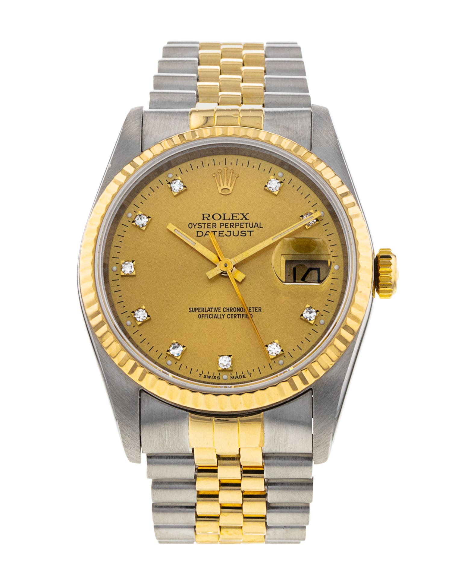 This Rolex Datejust 16233 has a champagne diamond dial and a bracelet strap. This Rolex has undergone a thorough inspection of water resistance, accuracy, functionality and condition to determine the level of reconditioning required to meet our strict standards. It has also been referenced against technical documents and manufacturer records where available to ensure authenticity and a clean history. All our watches have a 24-month warranty for your peace of mind. One of our skilled polishing technicians has removed marks on the case and bracelet of this watch, brought about by daily wear and tear, which is why this watch does not come with the remaining manufacturer’s warranty.