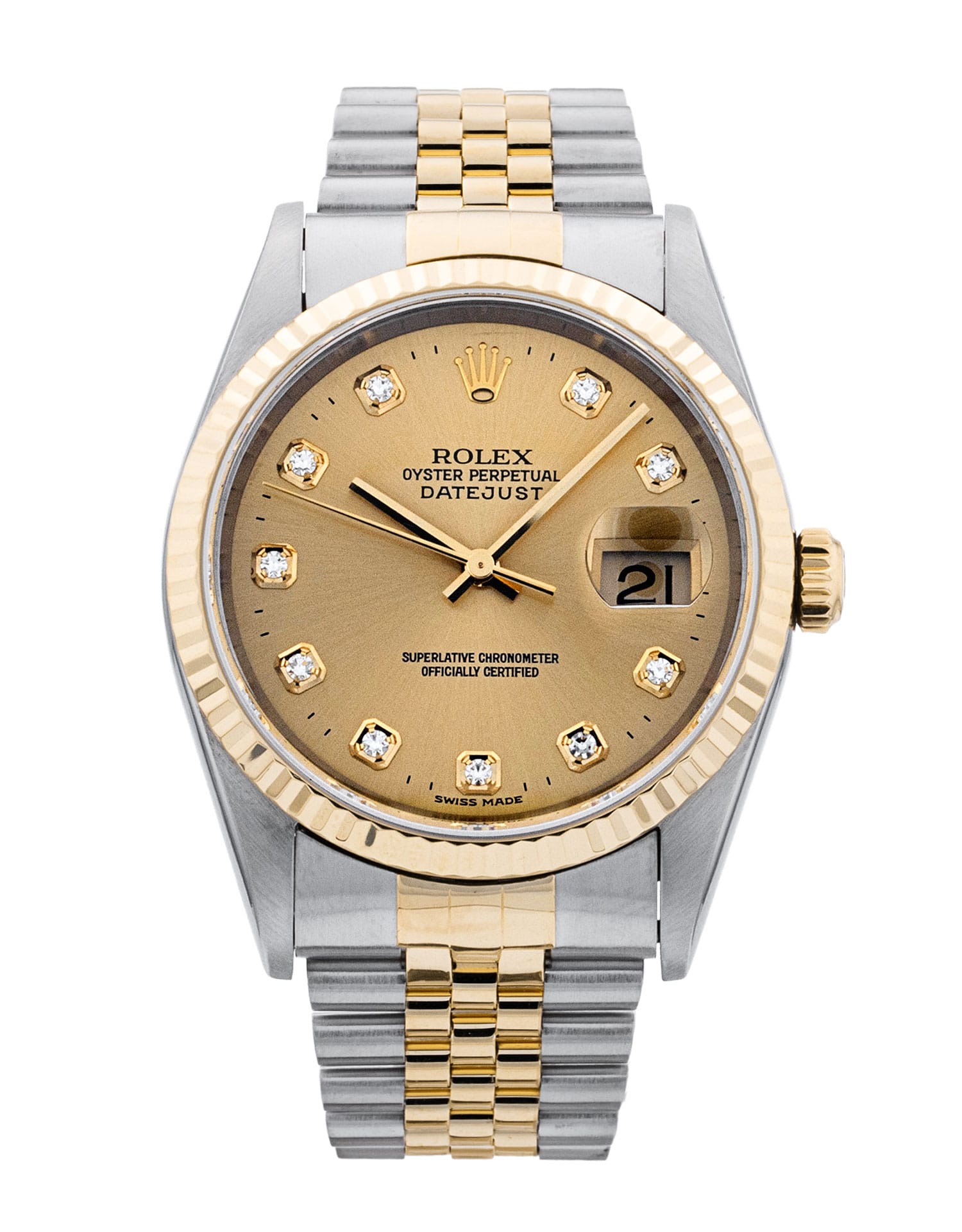 This Rolex Datejust 16233 has a champagne diamond dial and a bracelet strap. This Rolex has undergone a thorough inspection of water resistance, accuracy, functionality and condition to determine the level of reconditioning required to meet our strict standards. It has also been referenced against technical documents and manufacturer records where available to ensure authenticity and a clean history. All our watches have a 24-month warranty for your peace of mind. One of our skilled polishing technicians has removed marks on the case and bracelet of this watch, brought about by daily wear and tear, which is why this watch does not come with the remaining manufacturer’s warranty.