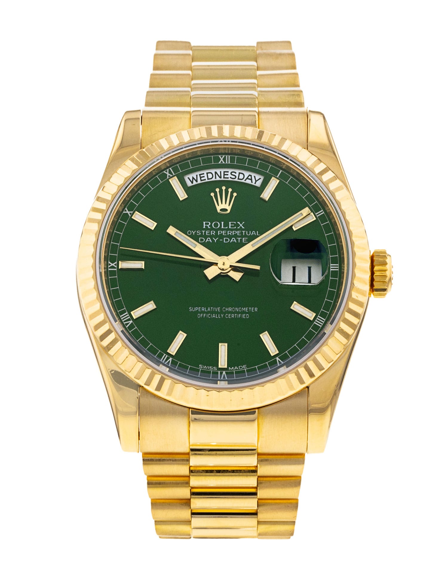 This Rolex Day-Date 118238 has a green baton dial and a bracelet strap. This Rolex has undergone a thorough inspection of water resistance, accuracy, functionality and condition to determine the level of reconditioning required to meet our strict standards. It has also been referenced against technical documents and manufacturer records where available to ensure authenticity and a clean history. All our watches have a 24-month warranty for your peace of mind. One of our skilled polishing technicians has removed marks on the case and bracelet of this watch, brought about by daily wear and tear, which is why this watch does not come with the remaining manufacturer’s warranty.