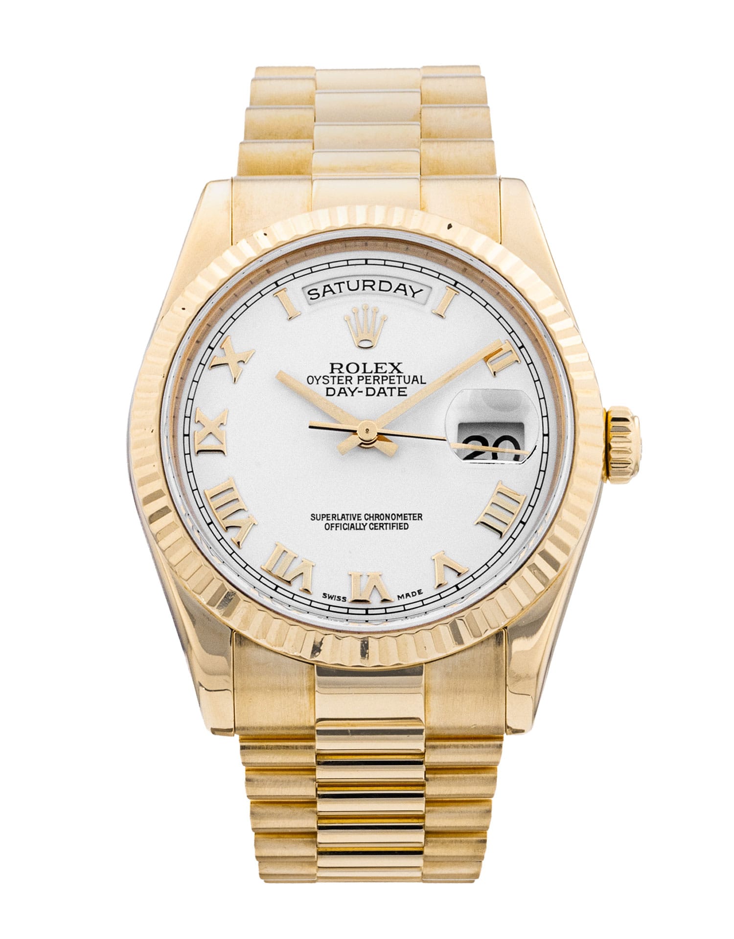 This Rolex Day-Date 118238 has a white roman numeral dial and a bracelet strap. This Rolex has undergone a thorough inspection of water resistance, accuracy, functionality and condition to determine the level of reconditioning required to meet our strict standards. It has also been referenced against technical documents and manufacturer records where available to ensure authenticity and a clean history. All our watches have a 24-month warranty for your peace of mind. One of our skilled polishing technicians has removed marks on the case and bracelet of this watch, brought about by daily wear and tear, which is why this watch does not come with the remaining manufacturer’s warranty.