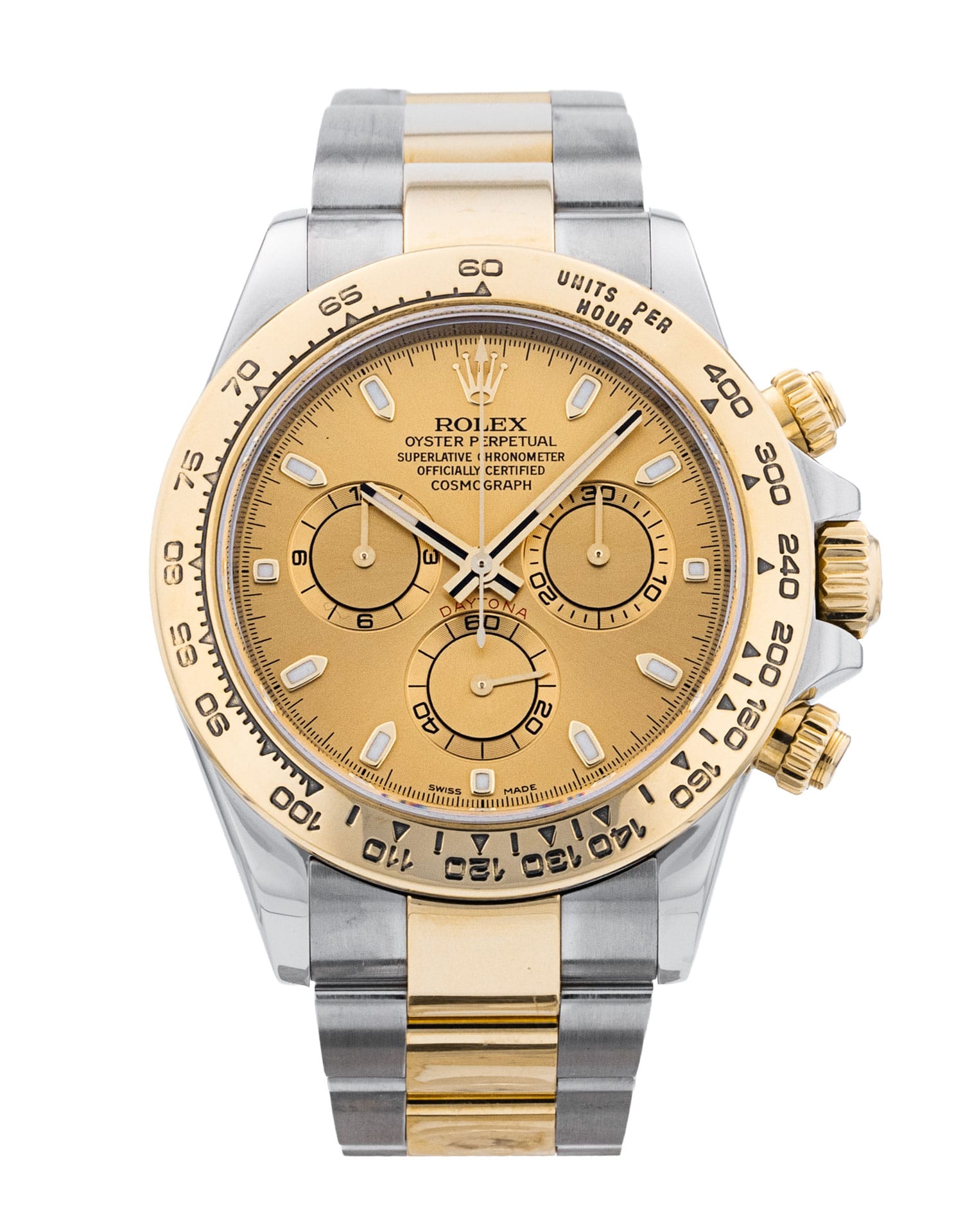 This Rolex Daytona 116503 has a champagne baton dial and a bracelet strap. This Rolex has undergone a thorough inspection of water resistance, accuracy, functionality and condition to determine the level of reconditioning required to meet our strict standards. It has also been referenced against technical documents and manufacturer records where available to ensure authenticity and a clean history. Our watches have a 24-month warranty for your peace of mind, in conjunction with any remaining manufacturer’s warranty from new or from service. To maintain the manufacturer’s warranty on this watch, it has not been polished in our service centre.