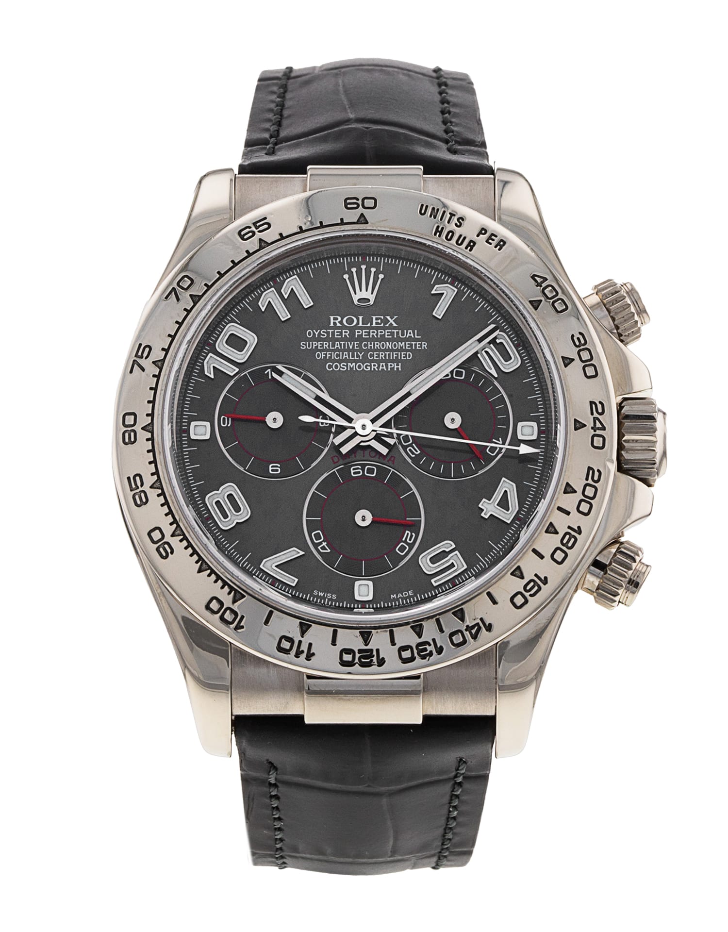 This Rolex Daytona 116519 has a slate arabic dial and a leather strap. This Rolex has undergone a thorough inspection of water resistance, accuracy, functionality and condition to determine the level of reconditioning required to meet our strict standards. It has also been referenced against technical documents and manufacturer records where available to ensure authenticity and a clean history. All our watches have a 24-month warranty for your peace of mind. One of our skilled polishing technicians has removed marks on the case and bracelet of this watch, brought about by daily wear and tear, which is why this watch does not come with the remaining manufacturer’s warranty.