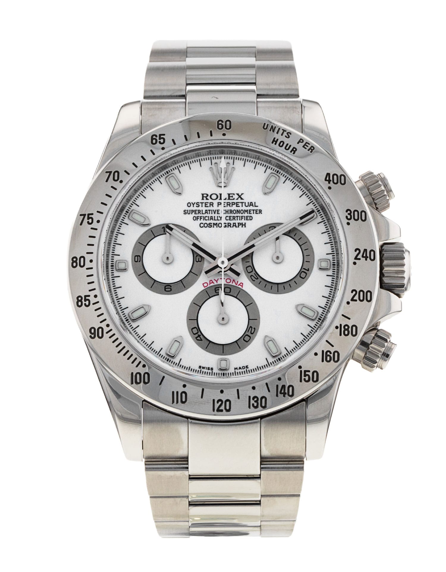 This Rolex Daytona 116520 has a white dial and a bracelet strap. This Rolex has undergone a thorough inspection of water resistance, accuracy, functionality and condition to determine the level of reconditioning required to meet our strict standards. It has also been referenced against technical documents and manufacturer records where available to ensure authenticity and a clean history. All our watches have a 24-month warranty for your peace of mind. One of our skilled polishing technicians has removed marks on the case and bracelet of this watch, brought about by daily wear and tear, which is why this watch does not come with the remaining manufacturer’s warranty.