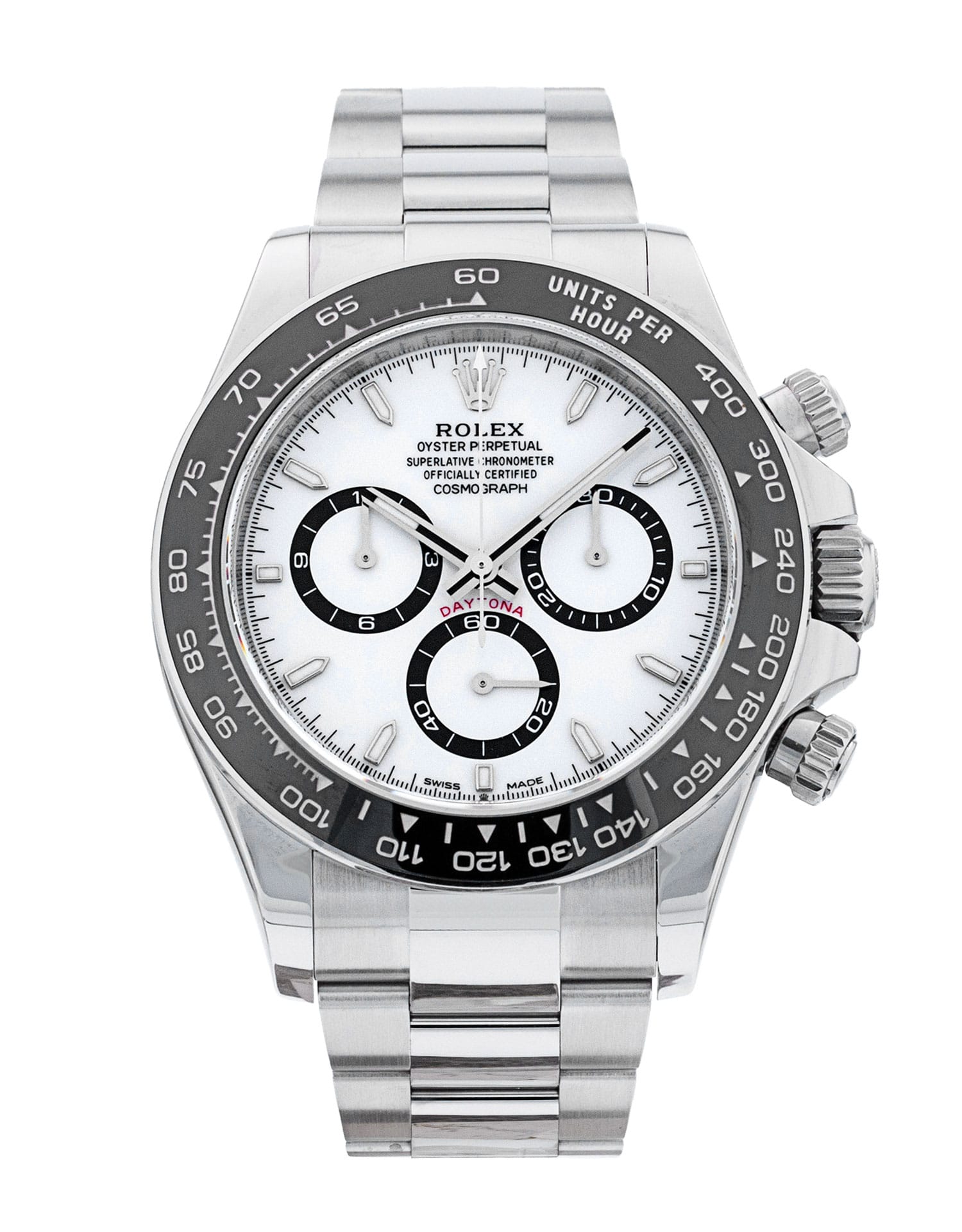 This Rolex Daytona 126500 LN has a white dial and a bracelet strap. This Rolex has undergone a thorough inspection of water resistance, accuracy, functionality and condition to determine the level of reconditioning required to meet our strict standards. It has also been referenced against technical documents and manufacturer records where available to ensure authenticity and a clean history. All our watches have a 24-month warranty for your peace of mind. One of our skilled polishing technicians has removed marks on the case and bracelet of this watch, brought about by daily wear and tear, which is why this watch does not come with the remaining manufacturer’s warranty.