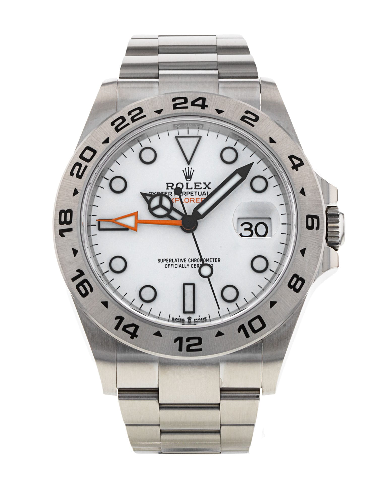 This Rolex Explorer II 216570 has a white dial and a bracelet strap. This Rolex has undergone a thorough inspection of water resistance, accuracy, functionality and condition to determine the level of reconditioning required to meet our strict standards. It has also been referenced against technical documents and manufacturer records where available to ensure authenticity and a clean history. Our watches have a 24-month warranty for your peace of mind, in conjunction with any remaining manufacturer’s warranty from new or from service. To maintain the manufacturer’s warranty on this watch, it has not been polished in our service centre.