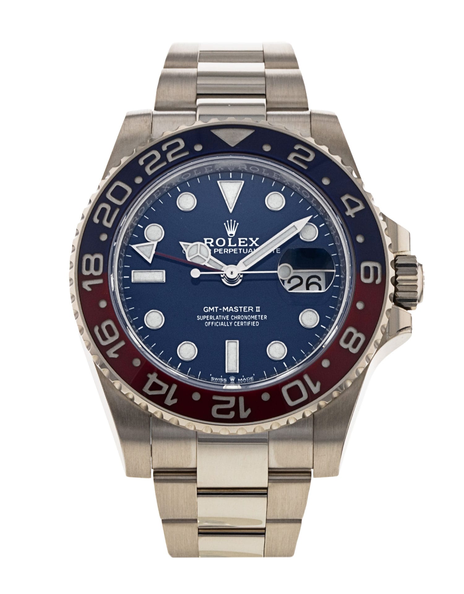 Partnering with one of the biggest American companies of the last century, Pan American Airways, Rolex created a watch that was capable of telling the time in more than one place or time zone—the GMT-Master. In 1983 the updated GMT-Master II was released, gaining the nickname “The Fat Lady” due to its chunky case. Later, in 2005, Rolex redesigned and rereleased the GMT-Master on its 50th anniversary by launching the GMT-Master II. This new release became the first Rolex sport watch with the new, larger case and ceramic bezel—famed for its scratch resistance and immunity to fading. Its updated 3186 calibre boasted some improvements compared to the older 3185, making the hour hand a lot easier to set. It also featured a new hairspring which was a lot less sensitive to temperature changes and magnetism—perfect for flying and travelling, just as the original intended. This special GMT-Master II—made of white gold—is the sequel to the watch that introduced the much-anticipated Pepsi ceramic bezel, now coming with a blue dial instead of white, for this second generation run.