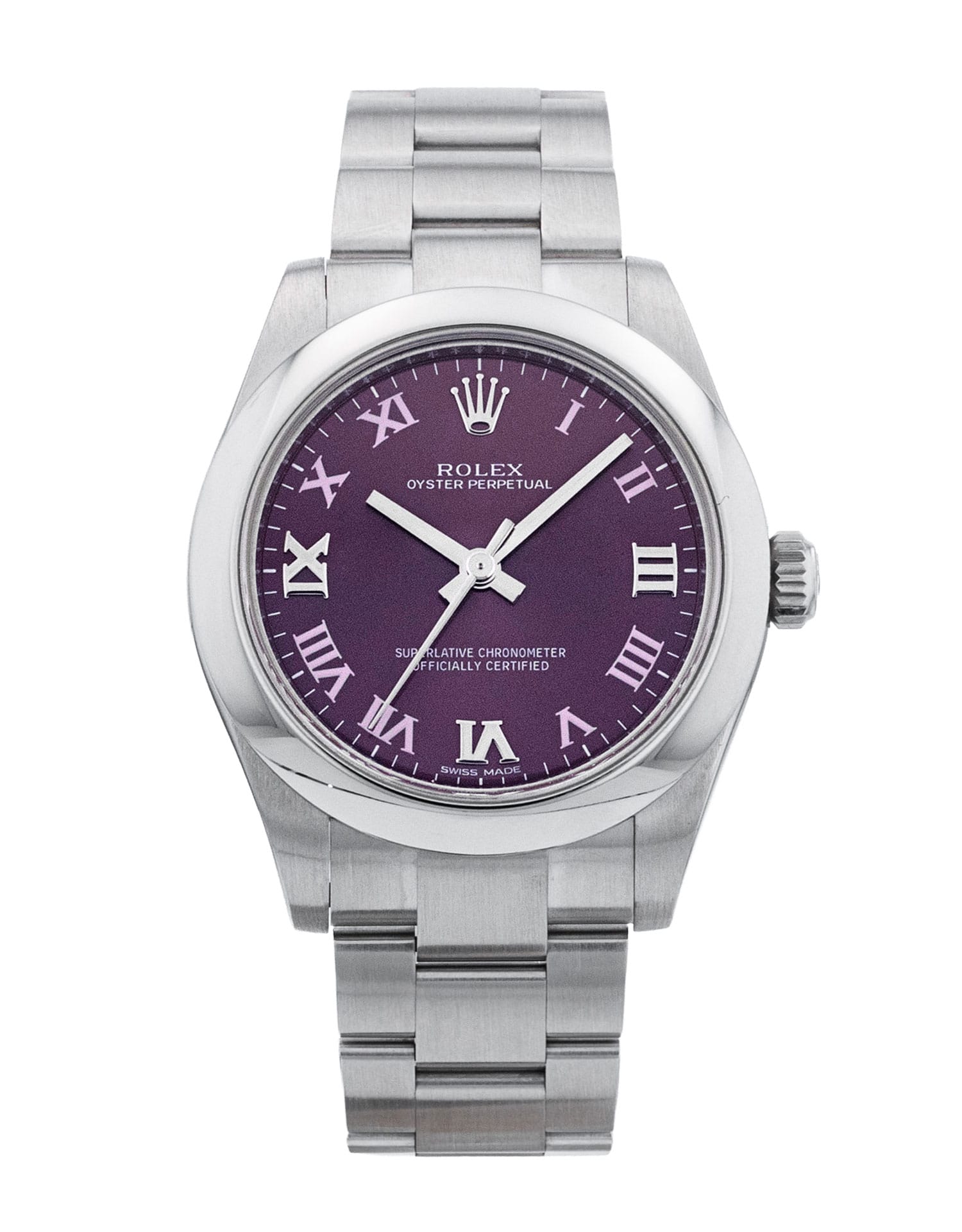 This Rolex Lady Oyster Perpetual 177200 has a red grape dial and a bracelet strap. This Rolex has undergone a thorough inspection of water resistance, accuracy, functionality and condition to determine the level of reconditioning required to meet our strict standards. It has also been referenced against technical documents and manufacturer records where available to ensure authenticity and a clean history. All our watches have a 24-month warranty for your peace of mind. One of our skilled polishing technicians has removed marks on the case and bracelet of this watch, brought about by daily wear and tear, which is why this watch does not come with the remaining manufacturer’s warranty.