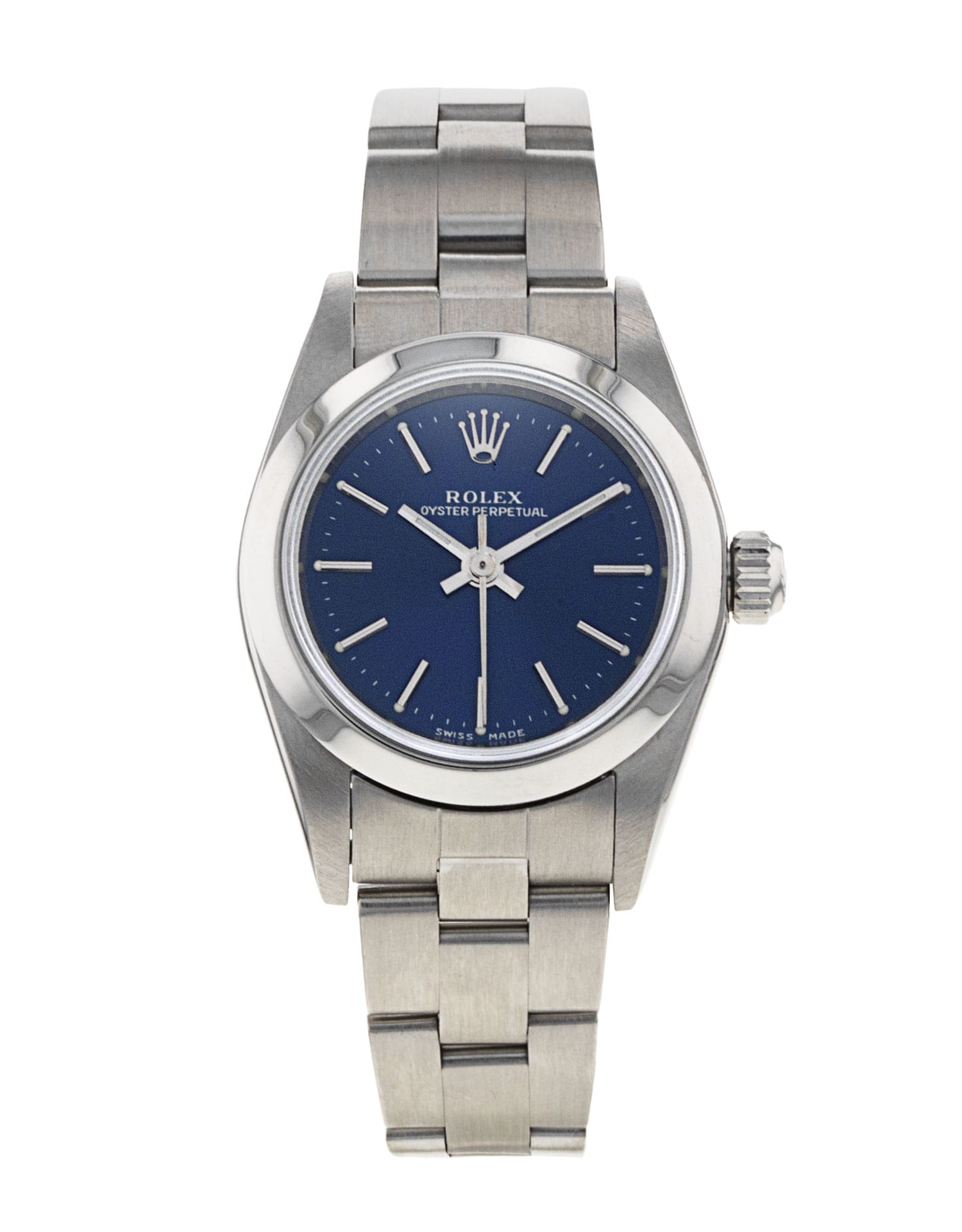 This Rolex Lady Oyster Perpetual 76080 has a blue baton dial and a bracelet strap. This Rolex has undergone a thorough inspection of water resistance, accuracy, functionality and condition to determine the level of reconditioning required to meet our strict standards. It has also been referenced against technical documents and manufacturer records where available to ensure authenticity and a clean history. All our watches have a 24-month warranty for your peace of mind. One of our skilled polishing technicians has removed marks on the case and bracelet of this watch, brought about by daily wear and tear, which is why this watch does not come with the remaining manufacturer’s warranty.