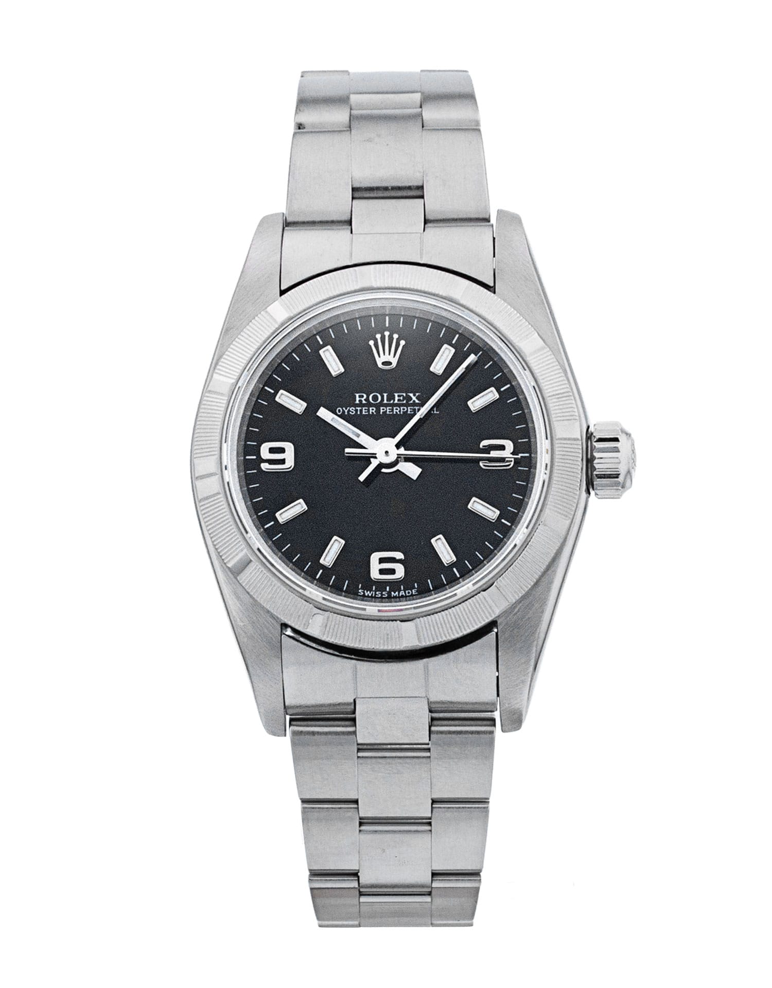 This Rolex Lady Oyster Perpetual 76080 has a black quarter arabic dial and a bracelet strap. This Rolex has undergone a thorough inspection of water resistance, accuracy, functionality and condition to determine the level of reconditioning required to meet our strict standards. It has also been referenced against technical documents and manufacturer records where available to ensure authenticity and a clean history. All our watches have a 24-month warranty for your peace of mind. One of our skilled polishing technicians has removed marks on the case and bracelet of this watch, brought about by daily wear and tear, which is why this watch does not come with the remaining manufacturer’s warranty.