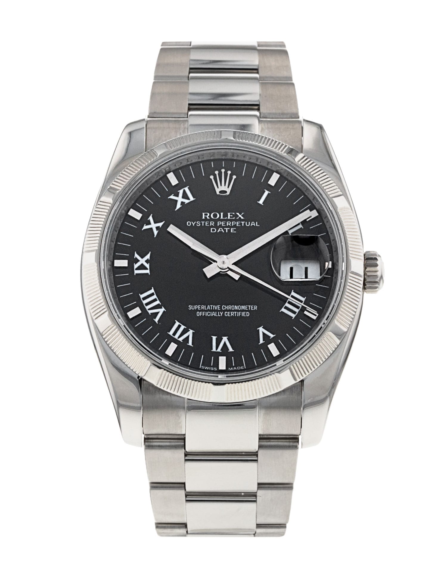 This Rolex Oyster Perpetual Date 115210 has a black roman numeral dial and a bracelet strap. This Rolex has undergone a thorough inspection of water resistance, accuracy, functionality and condition to determine the level of reconditioning required to meet our strict standards. It has also been referenced against technical documents and manufacturer records where available to ensure authenticity and a clean history. All our watches have a 24-month warranty for your peace of mind. One of our skilled polishing technicians has removed marks on the case and bracelet of this watch, brought about by daily wear and tear, which is why this watch does not come with the remaining manufacturer’s warranty.