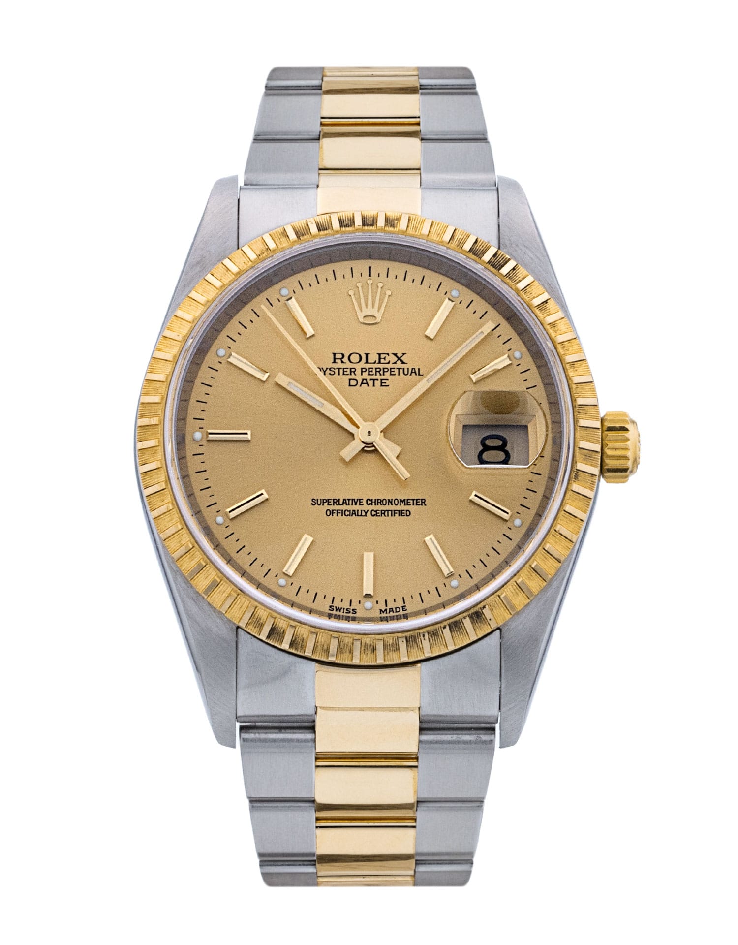 This Rolex Oyster Perpetual Date 15223 has a champagne baton dial and a bracelet strap. This Rolex has undergone a thorough inspection of water resistance, accuracy, functionality and condition to determine the level of reconditioning required to meet our strict standards. It has also been referenced against technical documents and manufacturer records where available to ensure authenticity and a clean history. All our watches have a 24-month warranty for your peace of mind. One of our skilled polishing technicians has removed marks on the case and bracelet of this watch, brought about by daily wear and tear, which is why this watch does not come with the remaining manufacturer’s warranty.