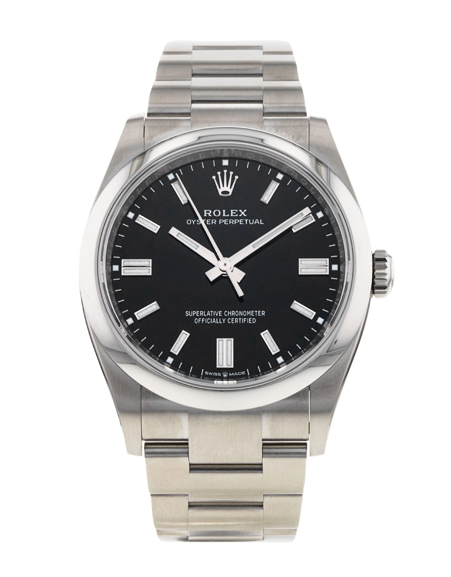 This Rolex Oyster Perpetual 126000 has a black baton dial and a bracelet strap. This Rolex has undergone a thorough inspection of water resistance, accuracy, functionality and condition to determine the level of reconditioning required to meet our strict standards. It has also been referenced against technical documents and manufacturer records where available to ensure authenticity and a clean history. Our watches have a 24-month warranty for your peace of mind, in conjunction with any remaining manufacturer’s warranty from new or from service. To maintain the manufacturer’s warranty on this watch, it has not been polished in our service centre.
