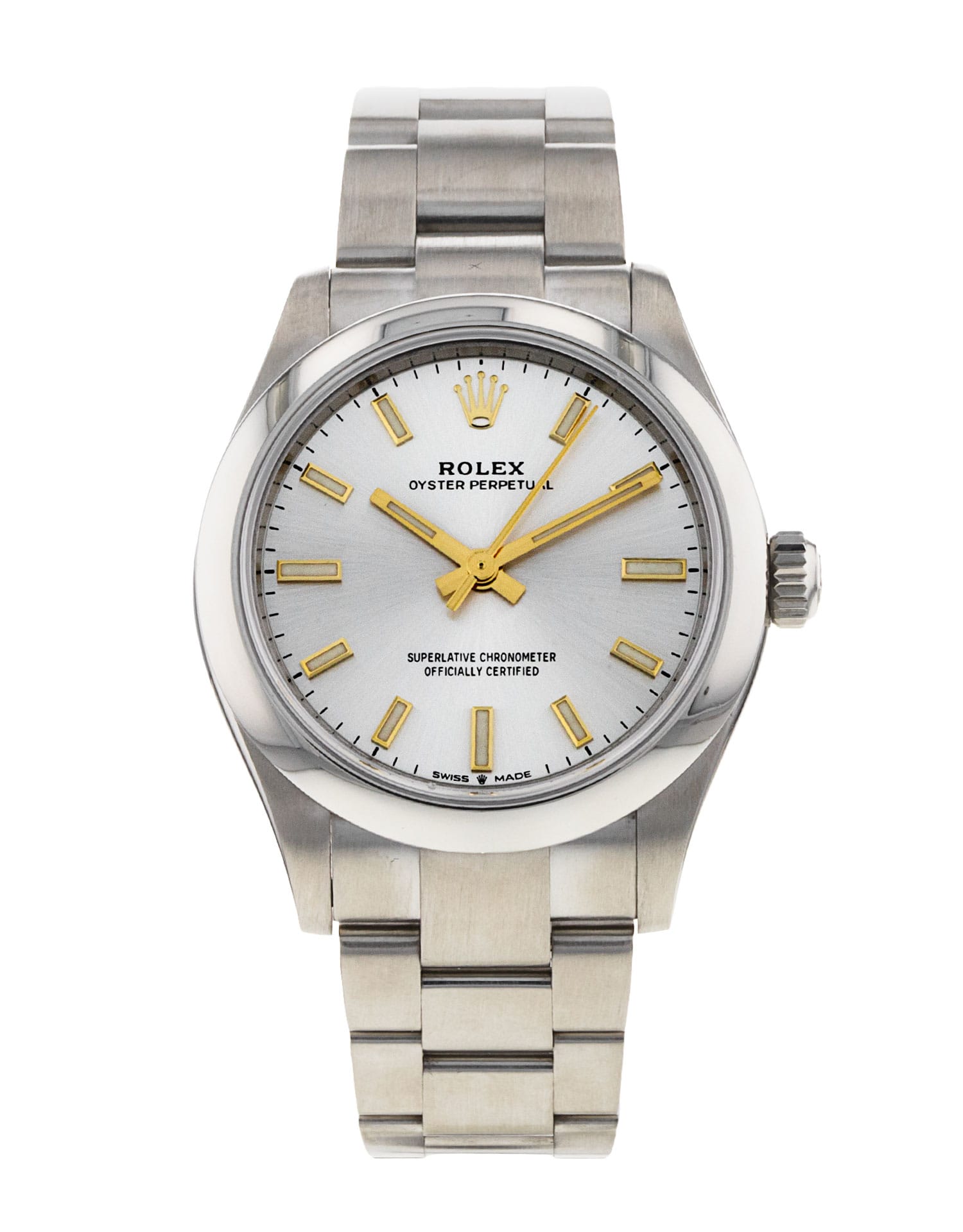 This Rolex Oyster Perpetual 277200 has a silver baton dial and a bracelet strap. This Rolex has undergone a thorough inspection of water resistance, accuracy, functionality and condition to determine the level of reconditioning required to meet our strict standards. It has also been referenced against technical documents and manufacturer records where available to ensure authenticity and a clean history. All our watches have a 24-month warranty for your peace of mind. One of our skilled polishing technicians has removed marks on the case and bracelet of this watch, brought about by daily wear and tear, which is why this watch does not come with the remaining manufacturer’s warranty.