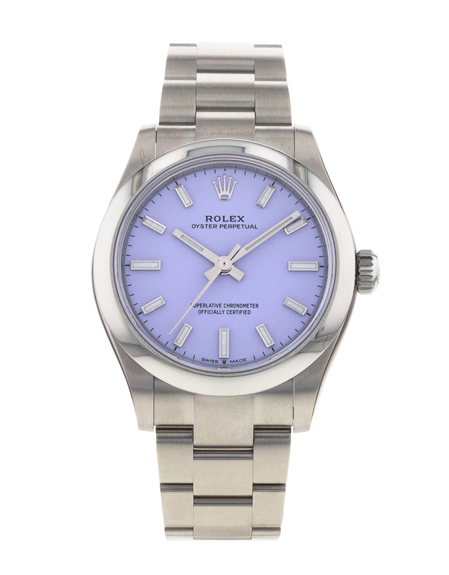 This Rolex Oyster Perpetual 277200 has a lavender dial and a bracelet strap. This Rolex has undergone a thorough inspection of water resistance, accuracy, functionality and condition to determine the level of reconditioning required to meet our strict standards. It has also been referenced against technical documents and manufacturer records where available to ensure authenticity and a clean history. Our watches have a 24-month warranty for your peace of mind, in conjunction with any remaining manufacturer’s warranty from new or from service. To maintain the manufacturer’s warranty on this watch, it has not been polished in our service centre.