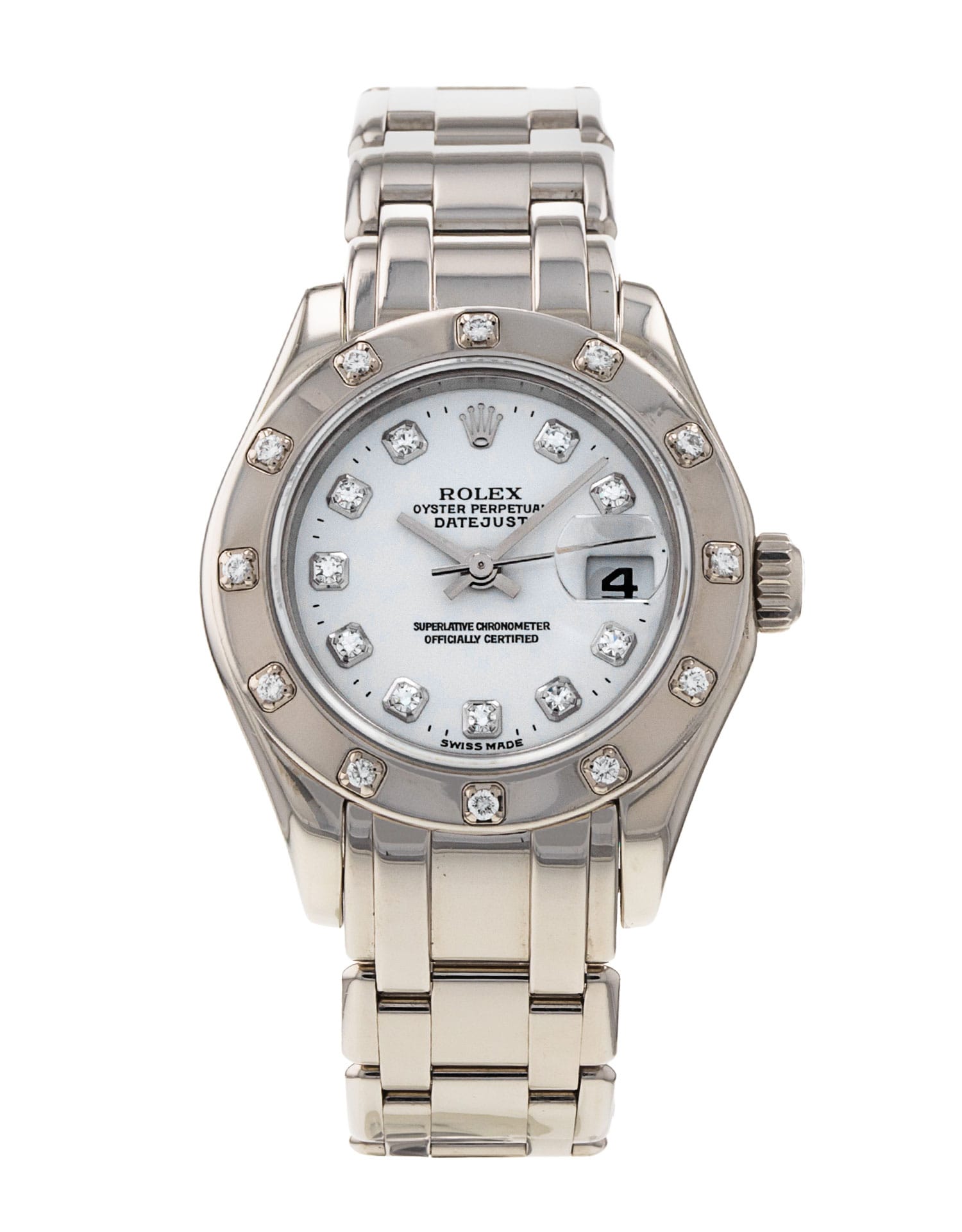 This Rolex Pearlmaster 80319 has a white diamond dial and a bracelet strap. This Rolex has undergone a thorough inspection of water resistance, accuracy, functionality and condition to determine the level of reconditioning required to meet our strict standards. It has also been referenced against technical documents and manufacturer records where available to ensure authenticity and a clean history. All our watches have a 24-month warranty for your peace of mind. One of our skilled polishing technicians has removed marks on the case and bracelet of this watch, brought about by daily wear and tear, which is why this watch does not come with the remaining manufacturer’s warranty.