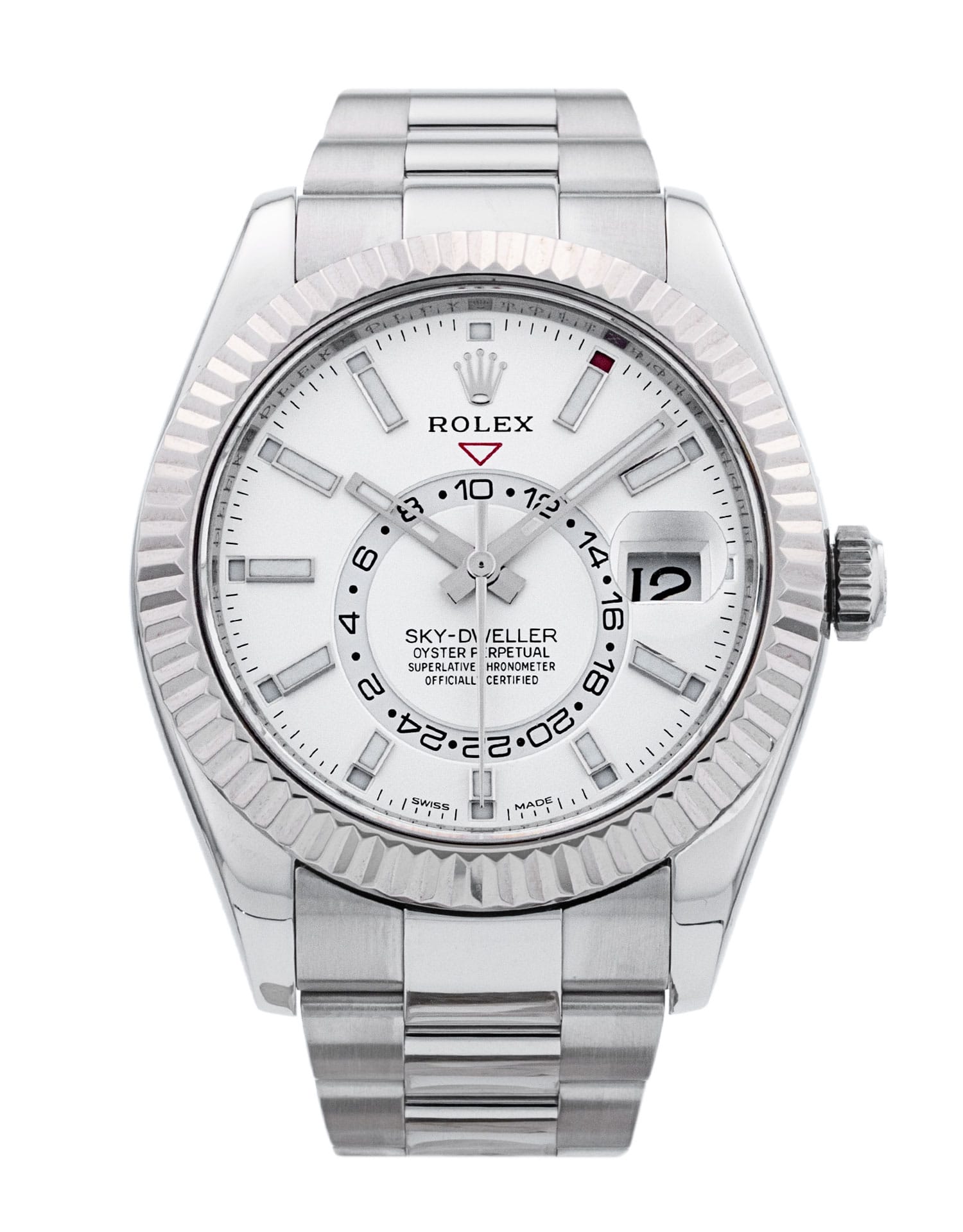 This Rolex Sky-Dweller 326934 has a white baton dial and a bracelet strap. This Rolex has undergone a thorough inspection of water resistance, accuracy, functionality and condition to determine the level of reconditioning required to meet our strict standards. It has also been referenced against technical documents and manufacturer records where available to ensure authenticity and a clean history. All our watches have a 24-month warranty for your peace of mind. One of our skilled polishing technicians has removed marks on the case and bracelet of this watch, brought about by daily wear and tear, which is why this watch does not come with the remaining manufacturer’s warranty.