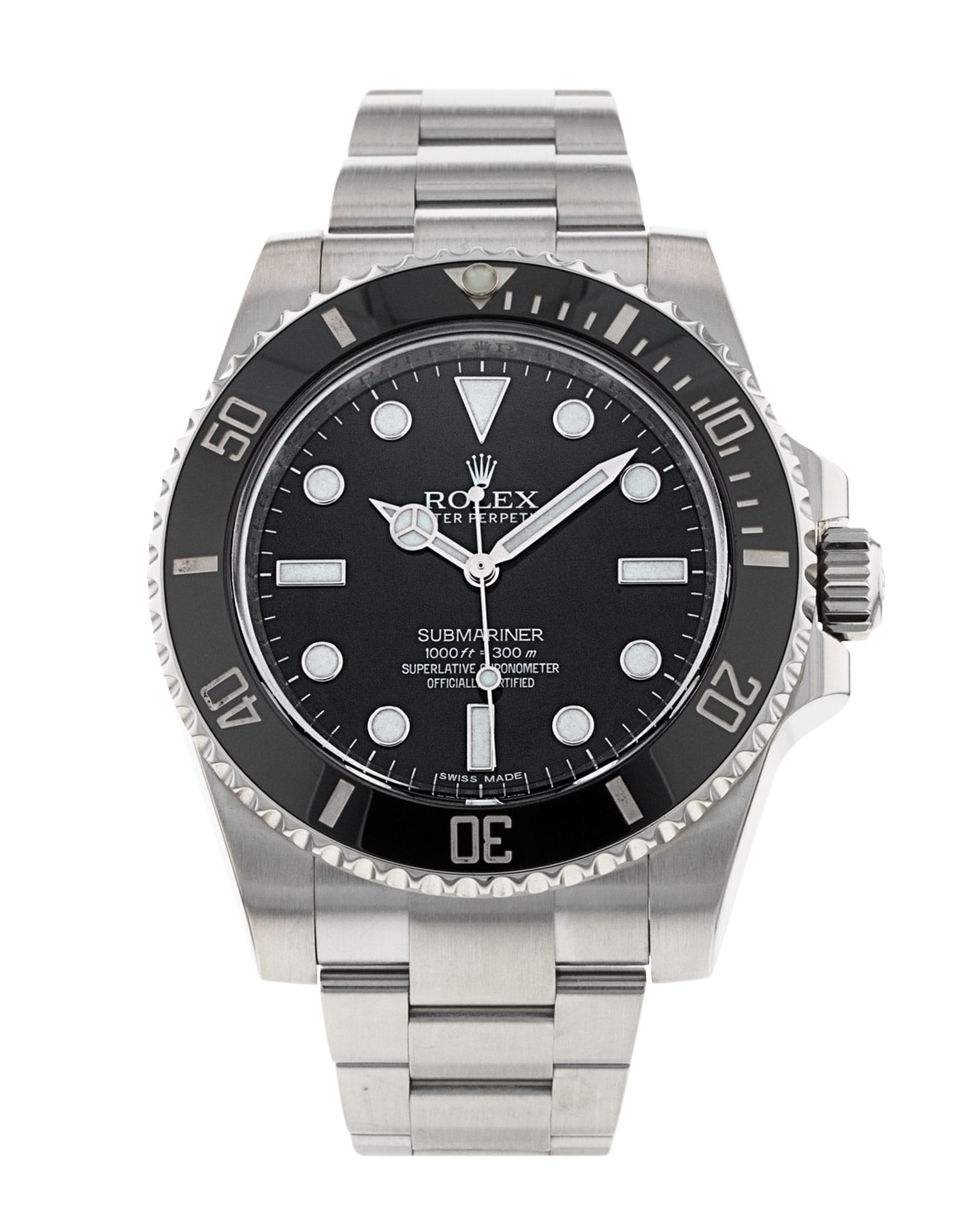This is a superb example of a 'no-date' Submariner—a model that is prized for its cleaner, pared-down look and symmetrical design that many collectors appreciate. The ref 114060 follows on from and updates the 14060M, which began life with series P in the year 2000—but its predecessor, the plain 14060, was in production as early as 1990. Fans will also point out that the original Submariners, from their introduction in 1953, did not have date windows. While this model continues to use the flawless in-house calibre 3130, it vastly improves the bezel with high-tech ceramic and also upgrades the bracelet.