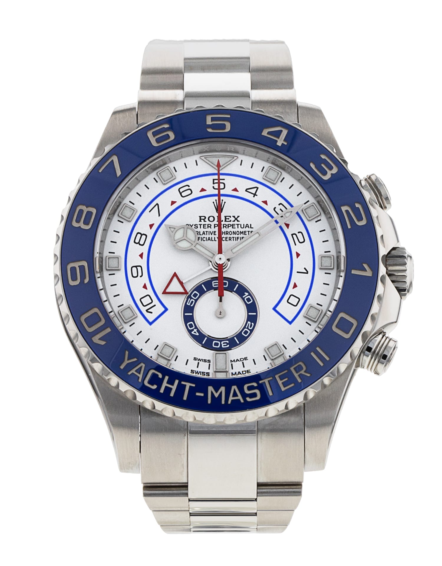 This Rolex Yacht-Master II 116680 has a white dial and a bracelet strap. This Rolex has undergone a thorough inspection of water resistance, accuracy, functionality and condition to determine the level of reconditioning required to meet our strict standards. It has also been referenced against technical documents and manufacturer records where available to ensure authenticity and a clean history. All our watches have a 24-month warranty for your peace of mind. One of our skilled polishing technicians has removed marks on the case and bracelet of this watch, brought about by daily wear and tear, which is why this watch does not come with the remaining manufacturer’s warranty.