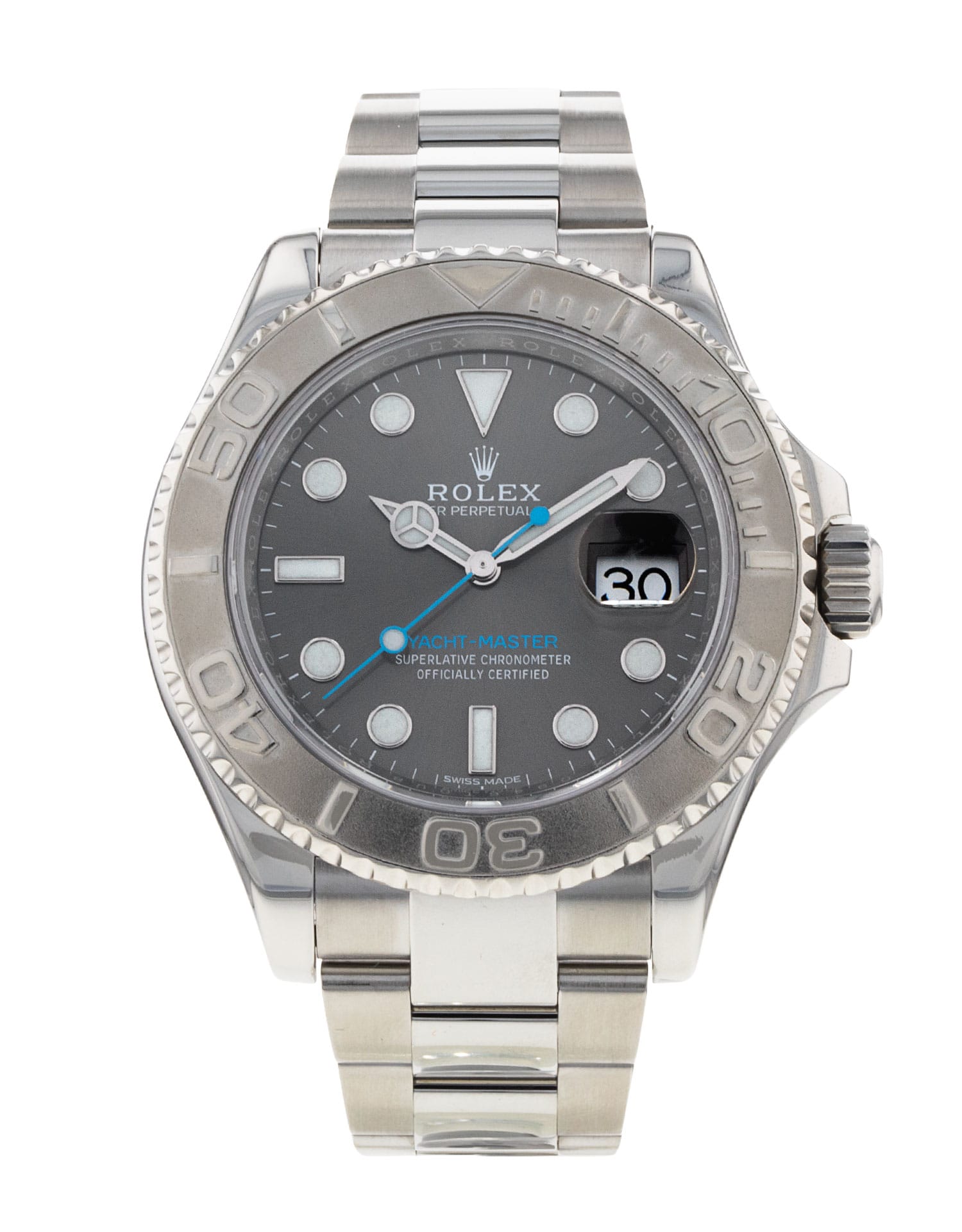 This Rolex Yacht-Master 116622 has a rhodium dial and a bracelet strap. This Rolex has undergone a thorough inspection of water resistance, accuracy, functionality and condition to determine the level of reconditioning required to meet our strict standards. It has also been referenced against technical documents and manufacturer records where available to ensure authenticity and a clean history. All our watches have a 24-month warranty for your peace of mind. One of our skilled polishing technicians has removed marks on the case and bracelet of this watch, brought about by daily wear and tear, which is why this watch does not come with the remaining manufacturer’s warranty.