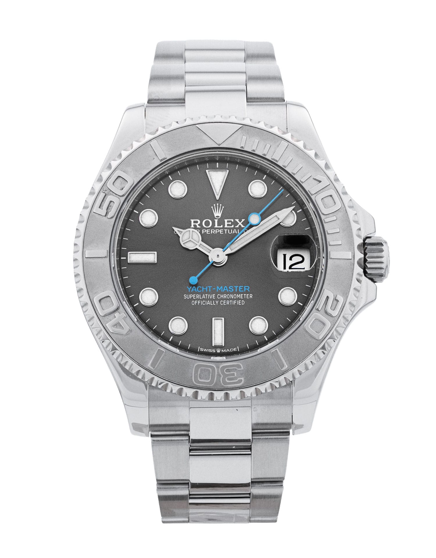 This Rolex Yacht-Master 268622 has a slate dial and a bracelet strap. This Rolex has undergone a thorough inspection of water resistance, accuracy, functionality and condition to determine the level of reconditioning required to meet our strict standards. It has also been referenced against technical documents and manufacturer records where available to ensure authenticity and a clean history. Our watches have a 24-month warranty for your peace of mind, in conjunction with any remaining manufacturer’s warranty from new or from service. To maintain the manufacturer’s warranty on this watch, it has not been polished in our service centre.