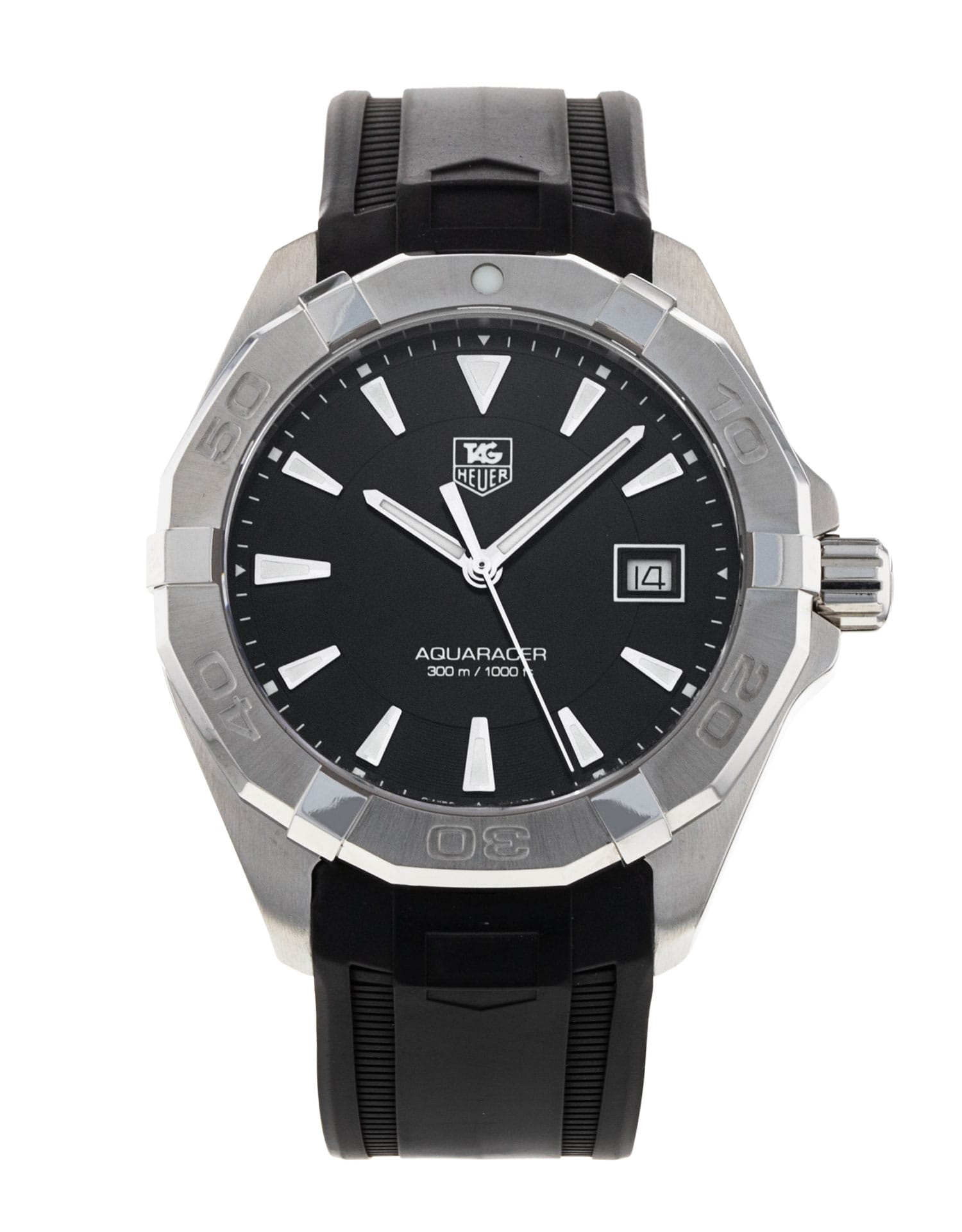 This Tag Heuer Aquaracer WAY1110.FT8021 has a black baton dial and a rubber strap. This Tag Heuer has undergone a thorough inspection of accuracy, functionality and condition at our Tag Heuer certified service centre to determine the level of reconditioning required to meet our strict standards. It has also been checked against our records to ensure authenticity. All our watches have a 24-month warranty for your peace of mind.