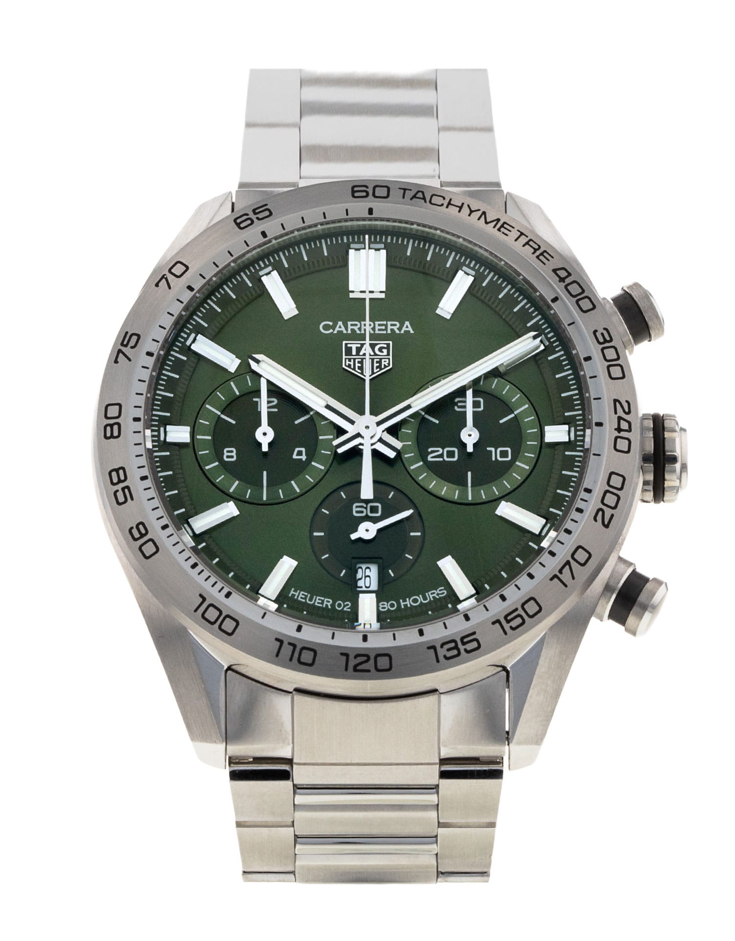 This Tag Heuer Carrera CBN2A10.BA0643 has a green baton dial and a bracelet strap. This Tag Heuer has undergone a thorough inspection of accuracy, functionality and condition at our Tag Heuer certified service centre to determine the level of reconditioning required to meet our strict standards. It has also been checked against our records to ensure authenticity. All our watches have a 24-month warranty for your peace of mind.
