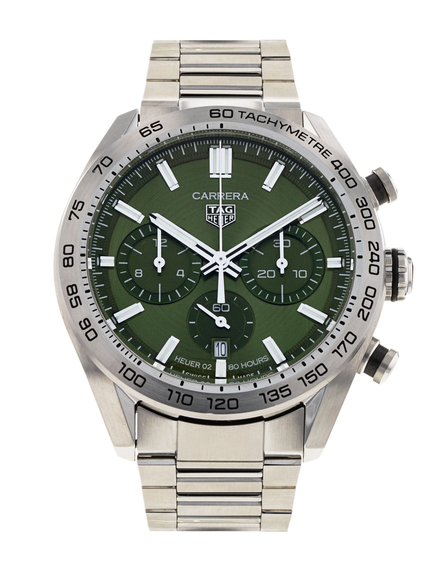 This Tag Heuer Carrera CBN2A10.BA0643 has a green baton dial and a bracelet strap. This Tag Heuer has undergone a thorough inspection of accuracy, functionality and condition at our Tag Heuer certified service centre to determine the level of reconditioning required to meet our strict standards. It has also been checked against our records to ensure authenticity. All our watches have a 24-month warranty for your peace of mind.