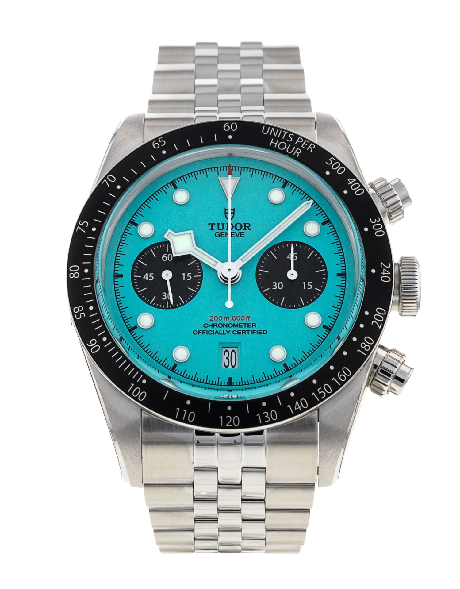 This Tudor Black Bay Chrono M79360N-0024 has a turquoise dial and a bracelet strap. This Tudor has undergone a thorough inspection of water resistance, accuracy, functionality and condition to determine the level of reconditioning required to meet our strict standards. It has also been referenced against technical documents and manufacturer records where available to ensure authenticity and a clean history. Our watches have a 24-month warranty for your peace of mind, in conjunction with any remaining manufacturer’s warranty from new or from service. To maintain the manufacturer’s warranty on this watch, it has not been polished in our service centre.