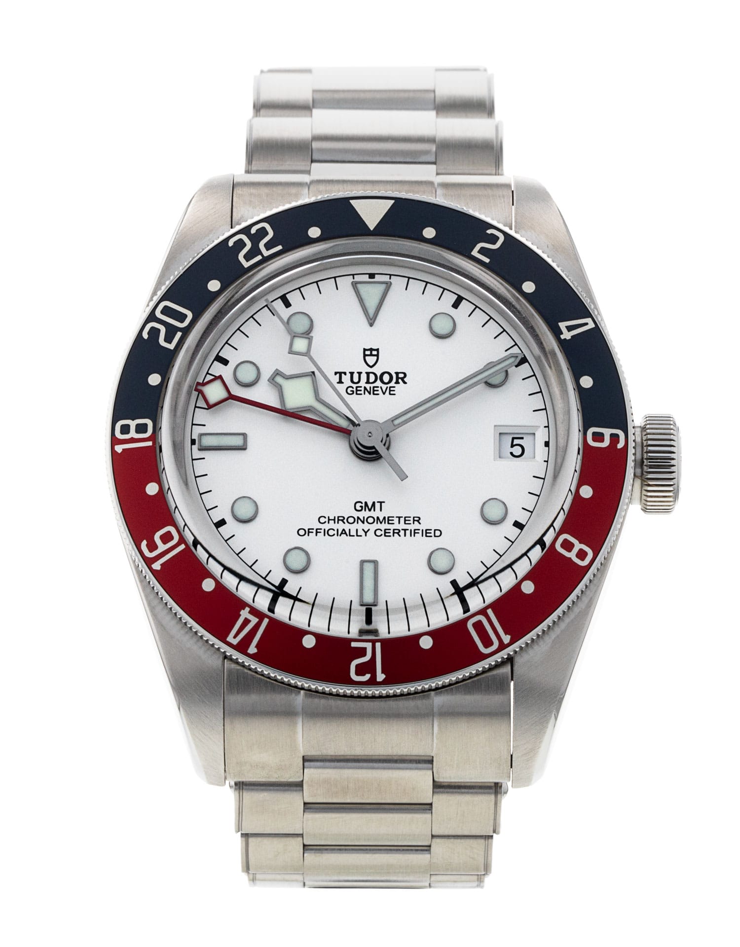 This Tudor Black Bay GMT M79830RB-0010 has a opaline dial and a bracelet strap. This Tudor has undergone a thorough inspection of water resistance, accuracy, functionality and condition to determine the level of reconditioning required to meet our strict standards. It has also been referenced against technical documents and manufacturer records where available to ensure authenticity and a clean history. All our watches have a 24-month warranty for your peace of mind. One of our skilled polishing technicians has removed marks on the case and bracelet of this watch, brought about by daily wear and tear, which is why this watch does not come with the remaining manufacturer’s warranty.