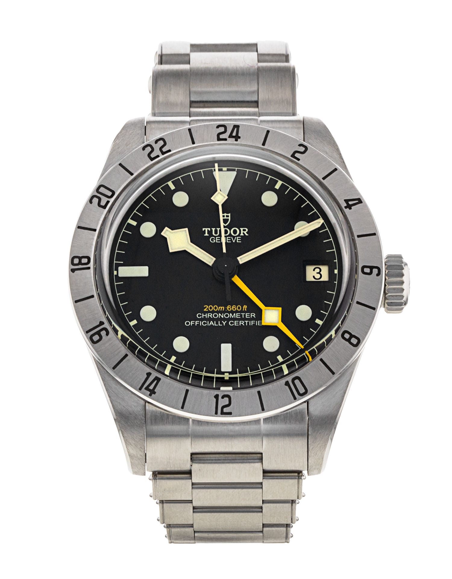 This Tudor Black Bay Pro M79470-0001 has a black dial and a bracelet strap. This Tudor has undergone a thorough inspection of water resistance, accuracy, functionality and condition to determine the level of reconditioning required to meet our strict standards. It has also been referenced against technical documents and manufacturer records where available to ensure authenticity and a clean history. All our watches have a 24-month warranty for your peace of mind. One of our skilled polishing technicians has removed marks on the case and bracelet of this watch, brought about by daily wear and tear, which is why this watch does not come with the remaining manufacturer’s warranty.